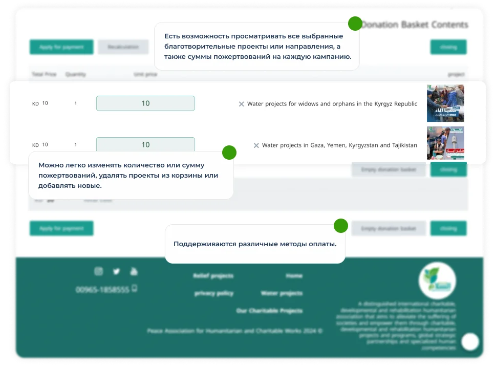 - Каждая инициатива отображается в виде карточки с описанием и предложенными вариантами сумм для пожертвования. Пользователь может выбрать кампанию, указать сумму и добавить её в корзину. Важно, что можно поддерживать сразу несколько проектов одновременно, добавляя их в корзину, как обычные товары.