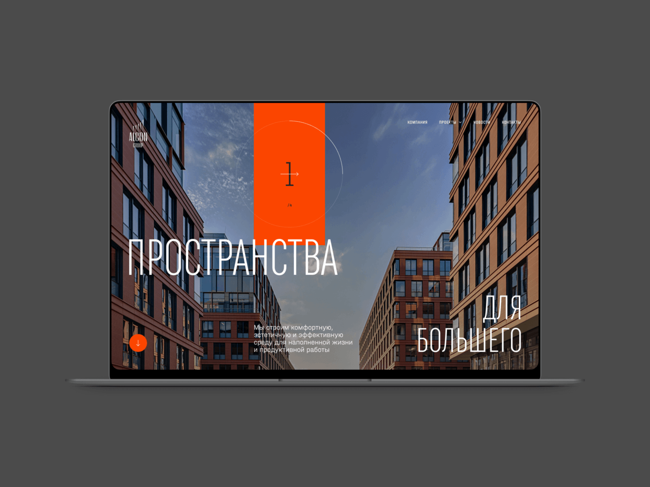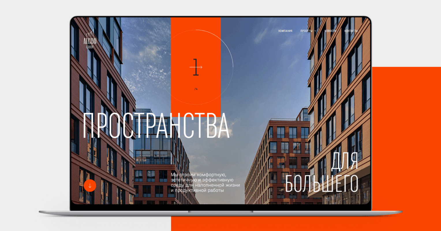 Визуал первого экрана сообщает ключевые концепты: энергичнотсь, технологичность, предприимчивость. Это задает настроение всему сайту, определяет восприятие компании.
