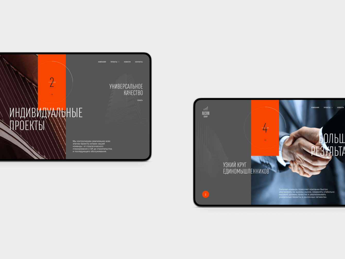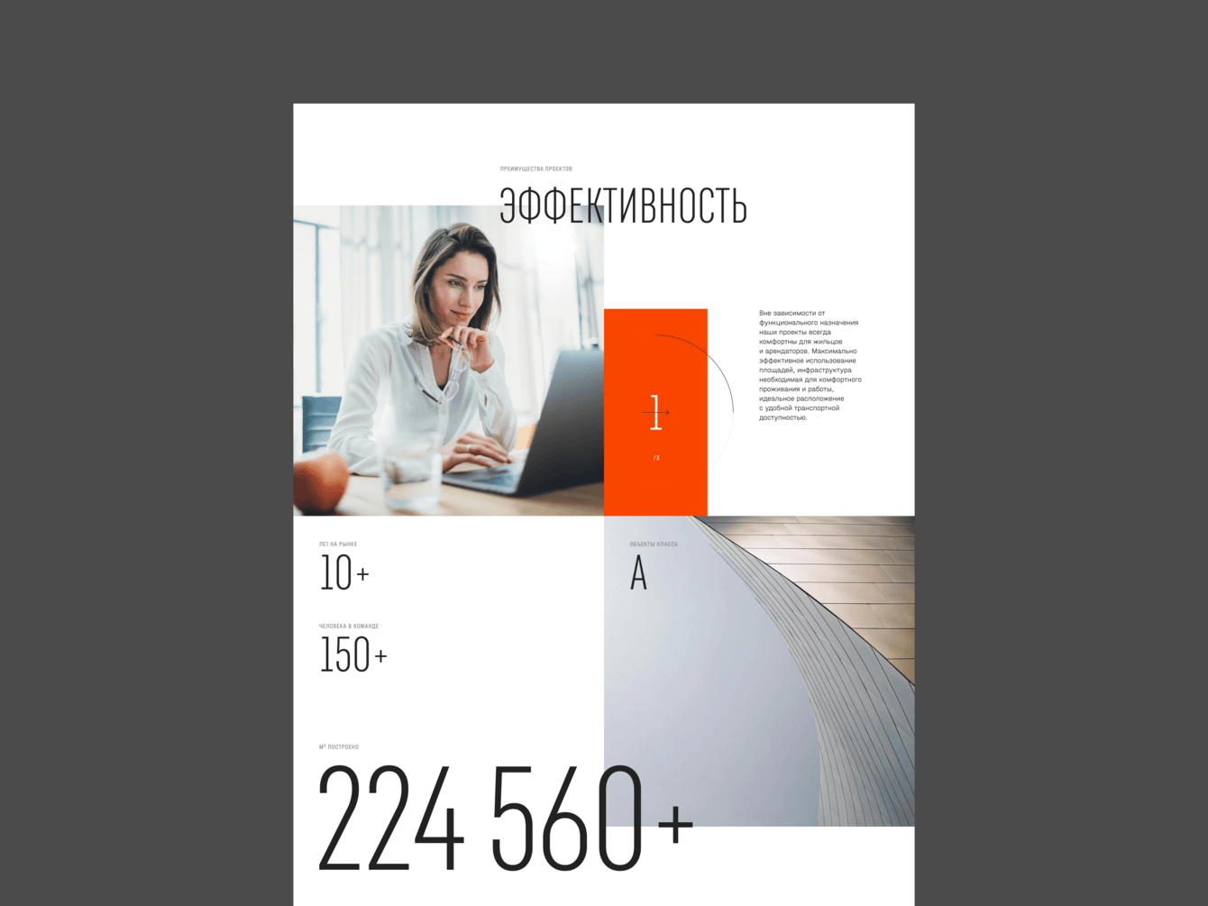 Тональность дизайна варьируется от строгого и формального до яркого и энергичного. Базой служит солидный деловой стиль, который наполняется жизнью за счет крупных форм и шрифтов, броских цветов и микроанимаций.
