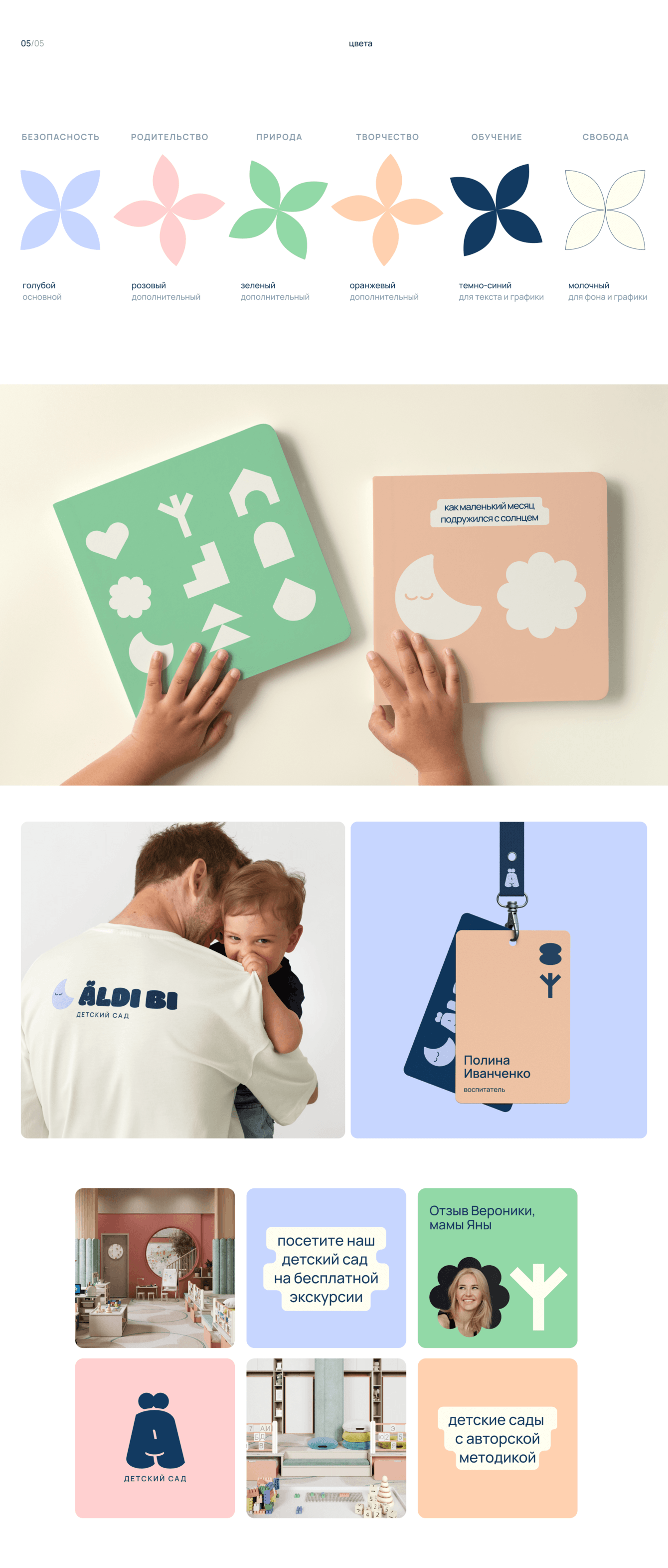 Мы подобрали мягкие, нежные оттенки — голубой в качестве основного, розовый, зеленый и оранжевый как дополнительные. Каждый цвет так же транслирует разные направления, которые лежат в основе Aldi BI — безопасность, родительство, природу и творчество.