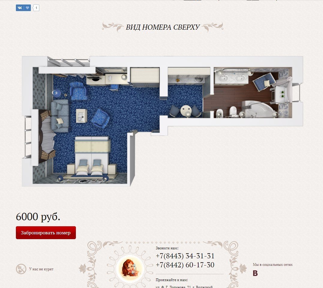 На странице каждого этажа на красивой план-схеме можно выбрать любой понравившийся номер, увидеть как он выглядит «сверху», посмотреть фотографии номера.