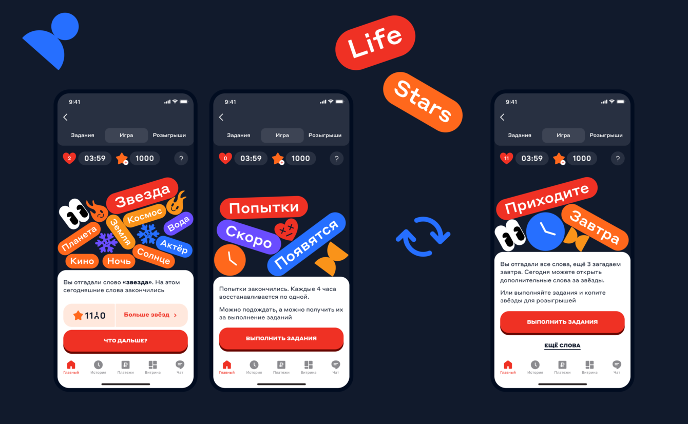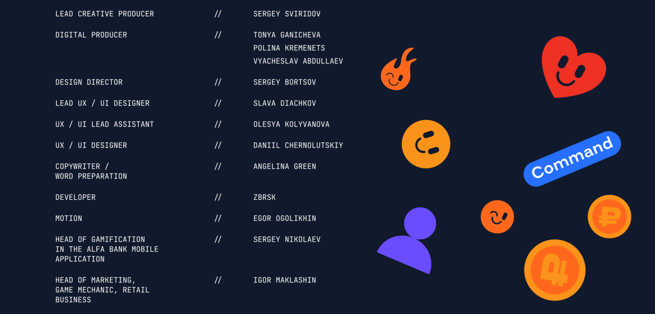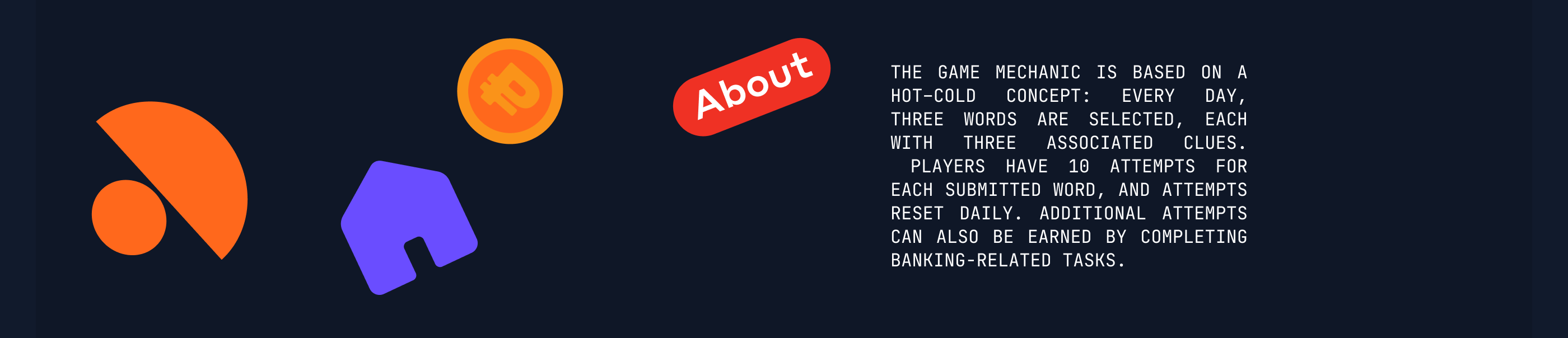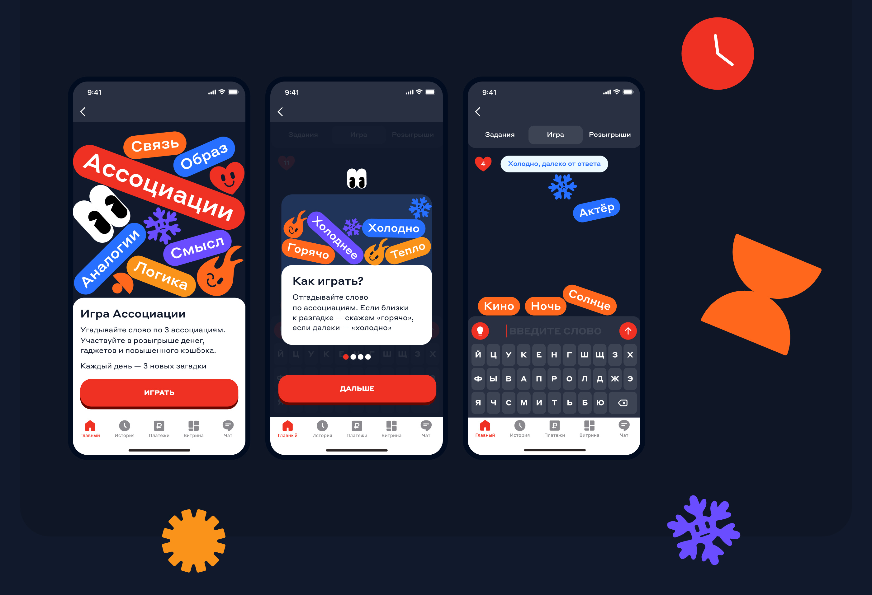 Тёмный фон работает как сцена, на которой хаотично «разбросаны» яркие стикеры со словами, ассоциациями и статусами. Все они выполнены в цветах Альфа-Банка, при этом цвет становится частью игровой логики: синий сигнализирует о неверном направлении, а по мере приближения к правильному ответу оттенки смещаются в сторону красного, усиливая ощущение прогресса и азарта