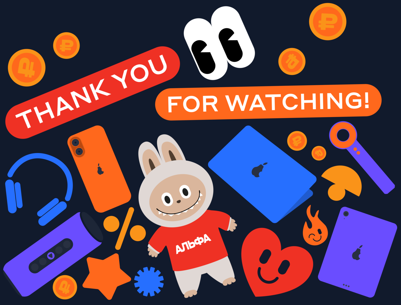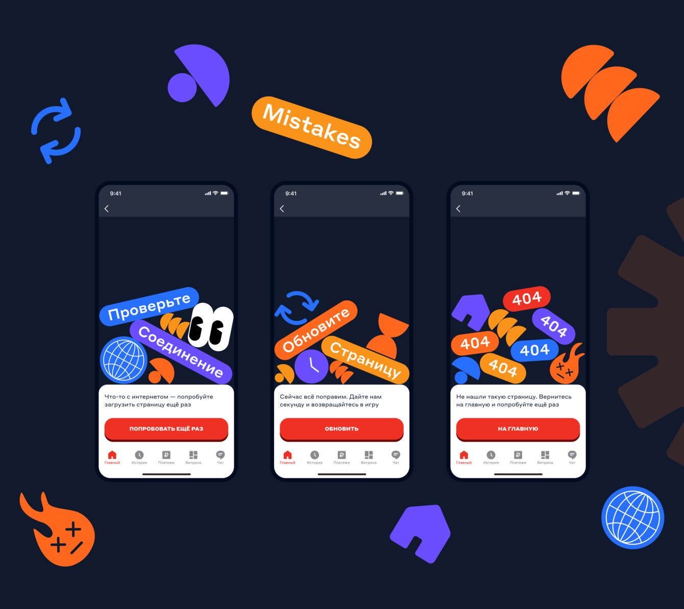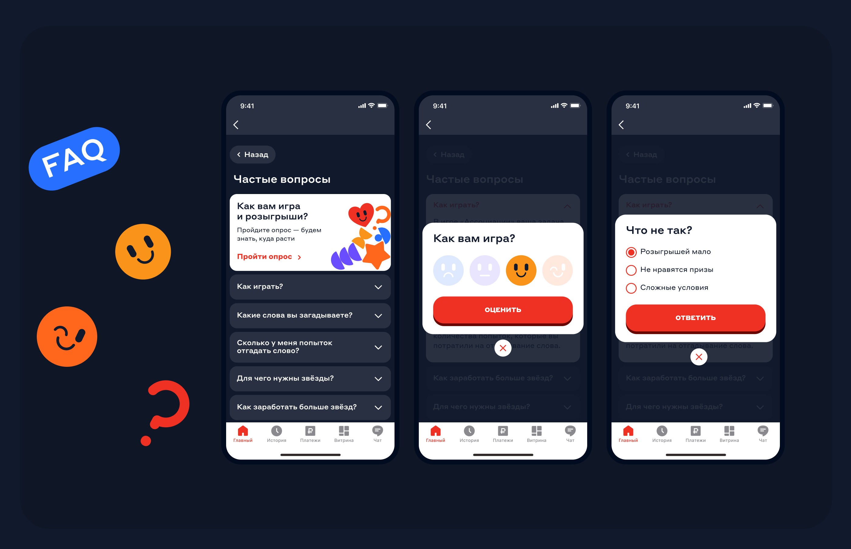 Тёмный фон работает как сцена, на которой хаотично «разбросаны» яркие стикеры со словами, ассоциациями и статусами. Все они выполнены в цветах Альфа-Банка, при этом цвет становится частью игровой логики: синий сигнализирует о неверном направлении, а по мере приближения к правильному ответу оттенки смещаются в сторону красного, усиливая ощущение прогресса и азарта