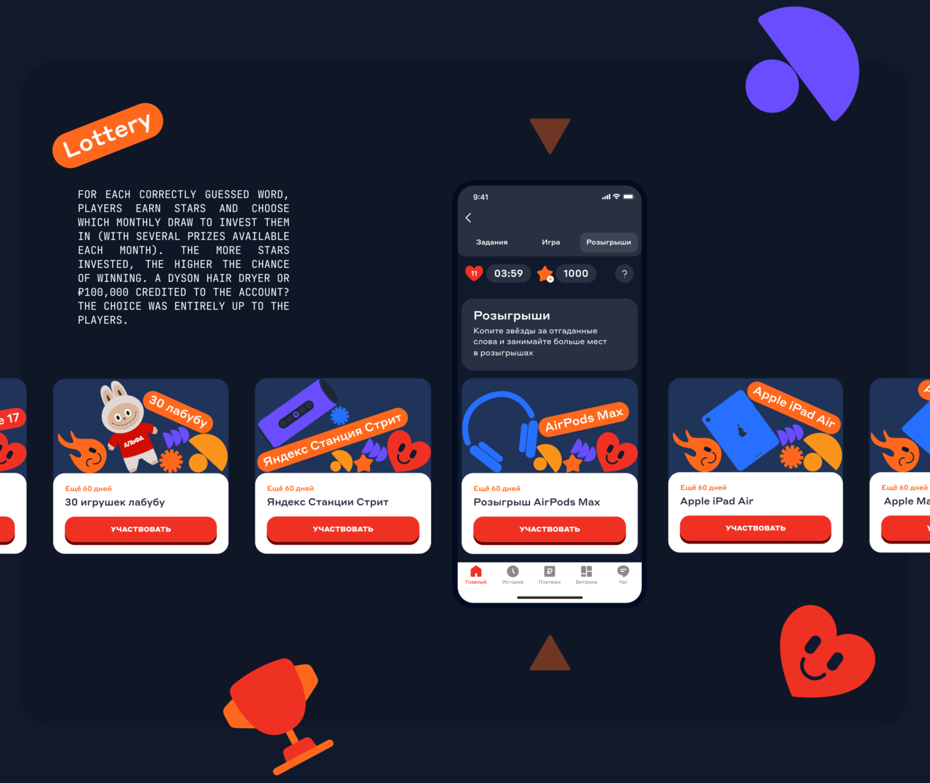 За отгаданное слово игроки получают звёзды и выбирают в какой ежемесячный розыгрыш вложиться (несколько призов в месяц). Чем больше звёзд вложено, тем больше шансов выиграть. Фен Dyson или 100 000₽ на счёт? Решали игроки