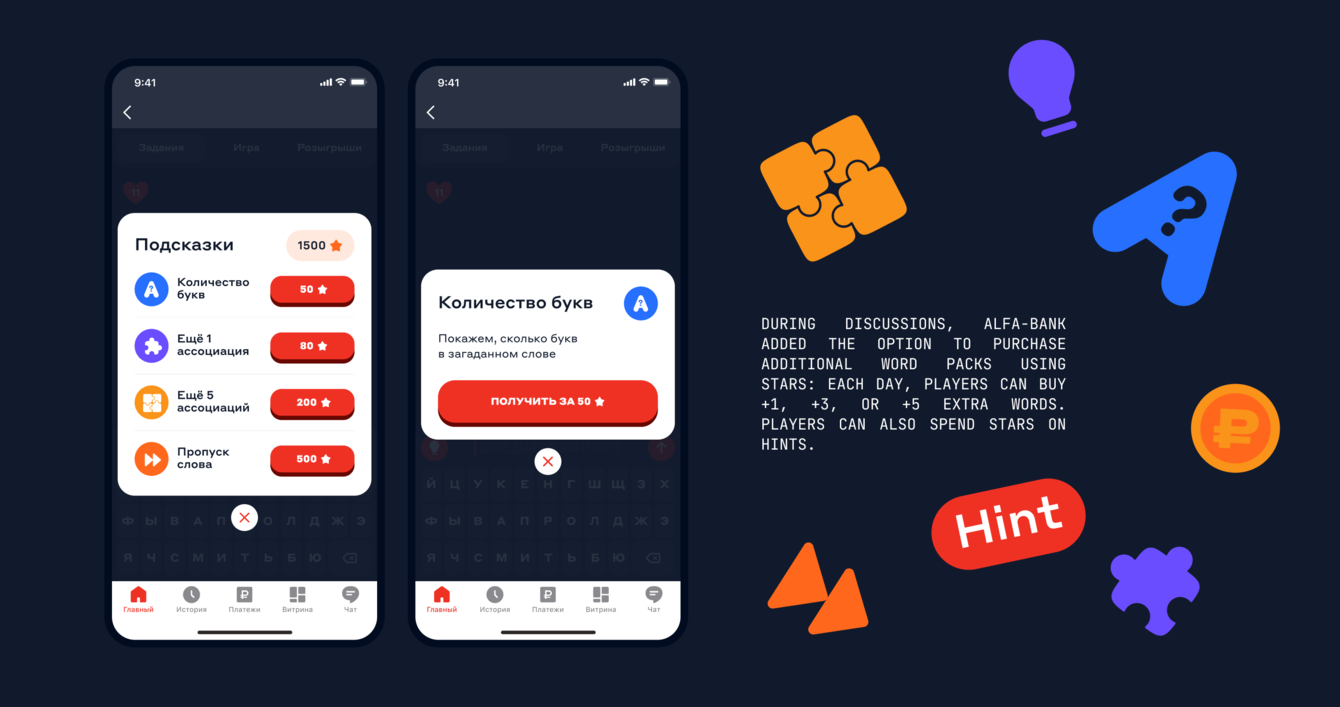 В ходе обсуждений Альфа-Банка добавили возможность за звёзды докупать наборы слов, каждый день можно купить +1, +3, +5 слов. Также, за звёзды игроки могут покупать подсказки