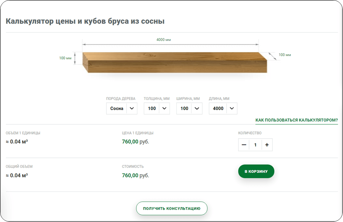 Важной деталью проекта стал калькулятор, который позволяет позволяет рассчитать необходимое количество материалов. Калькулятор разработан специально для проекта и он позволяет оформить заказ прямо из расчетов.