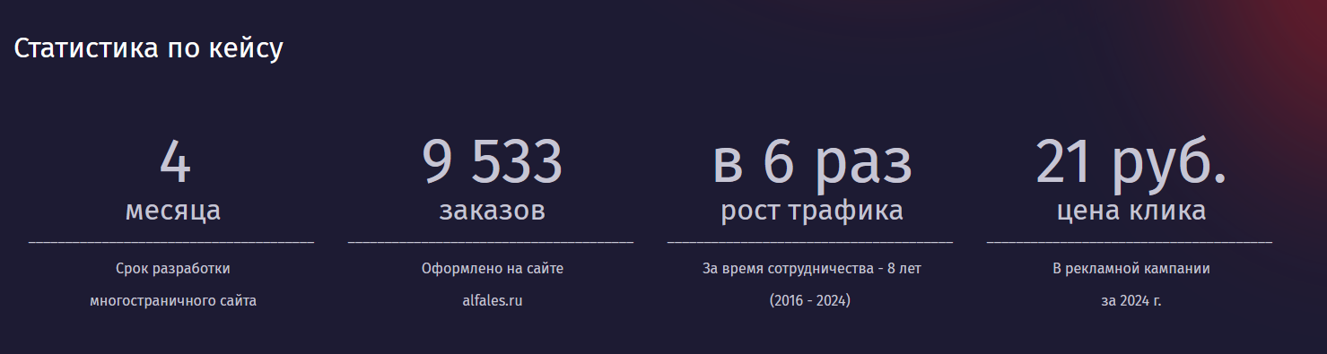 В 2016 году мы начали работу над сайтом для компании «Альфа‑лес», затем работали над развитием проекта. Сегодня, спустя 9 лет, мы по‑прежнему вместе. За эти годы мы много раз пробивали потолок трафика, каждый раз показывая всё лучшие результаты. Доверие нельзя купить, но его можно заслужить.