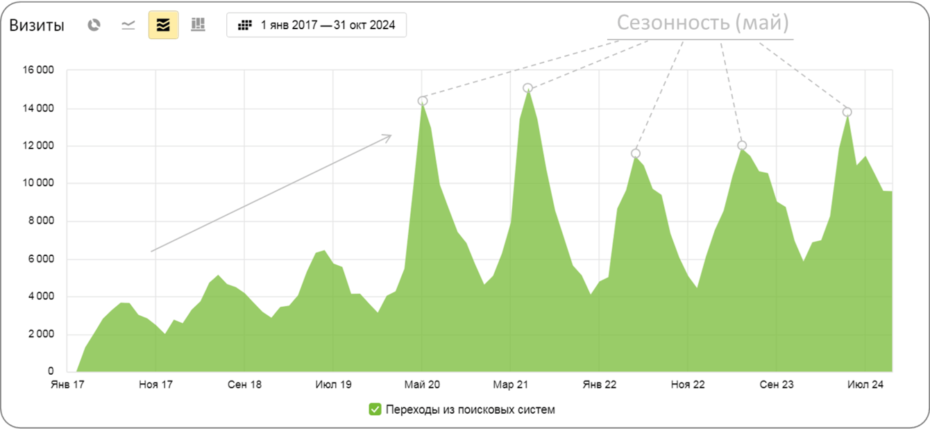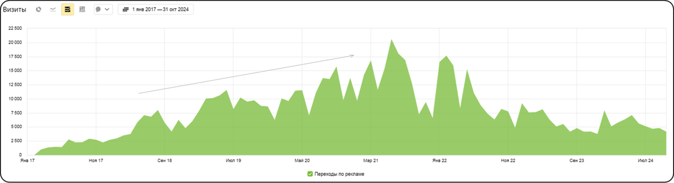 С 2018 по 2025 стратегия продвижения была направлена рост трафика и количества заказов, мы продолжали улучшать каталог товаров, регулировать ключевые слова и объявления в контекстной рекламе, а также постоянно следили и исправляли ошибки, которые выдавали отчеты Вебмастеров.