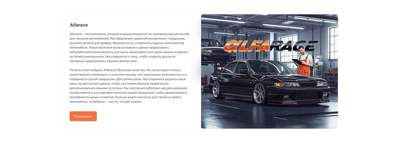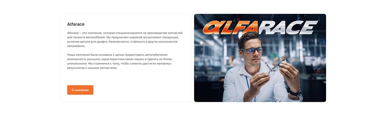 В блоке «О компании» клиенту было важно показать себя как проектировщика и изготовителя, а не продавца или установщика. Поэтому второй вариант с инженером, который держит спроектированную им деталь, полностью устроил Alfarace.