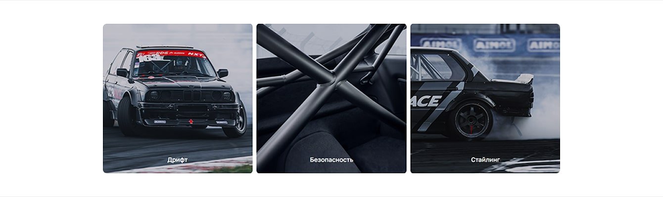 Мы отобрали для 1-го и 3-го баннера фотографии с похожим ракурсом из представленной командой подборки и обработали, чтобы смотрелось интересно. Для среднего баннера не удалось найти подходящего аналога, поэтому изменили цвет и подставили дымный фон с гоночной трассы.