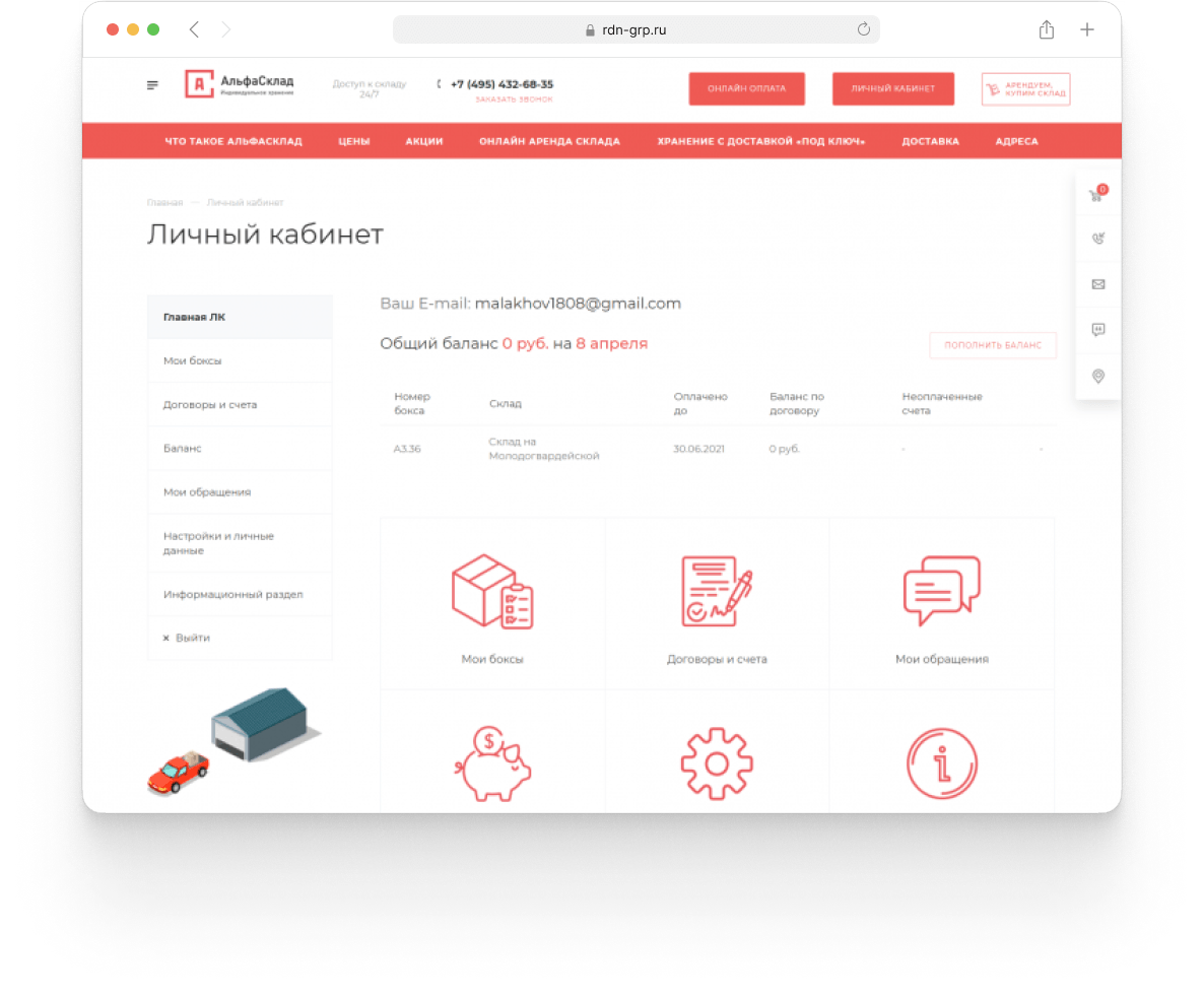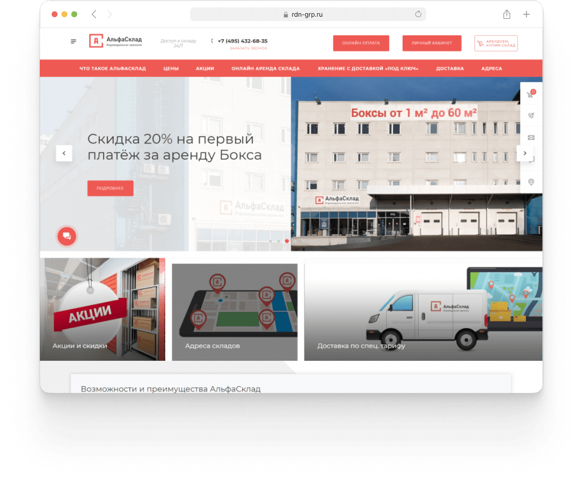 Сайт также был развернут на тестовом сервере, произведена настройка шаблонов страниц для web и мобильной версии, отрисованы схемы складов для онлайн-аренды.