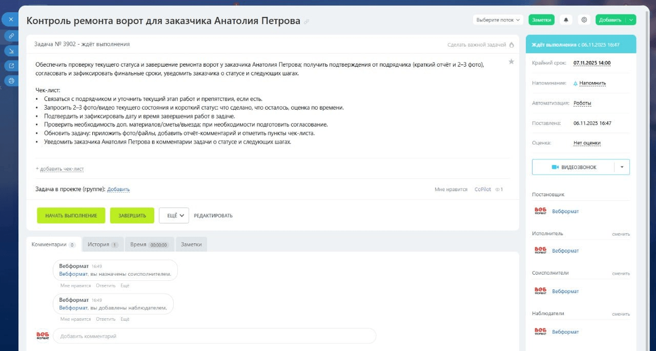 Менеджер Иванов видит задачу, берет под козырек и отправляется узнавать, что же там с ремонтом ворот заказчика Петрова. Процесс идет, все автоматизировано, руководитель не тратит время.