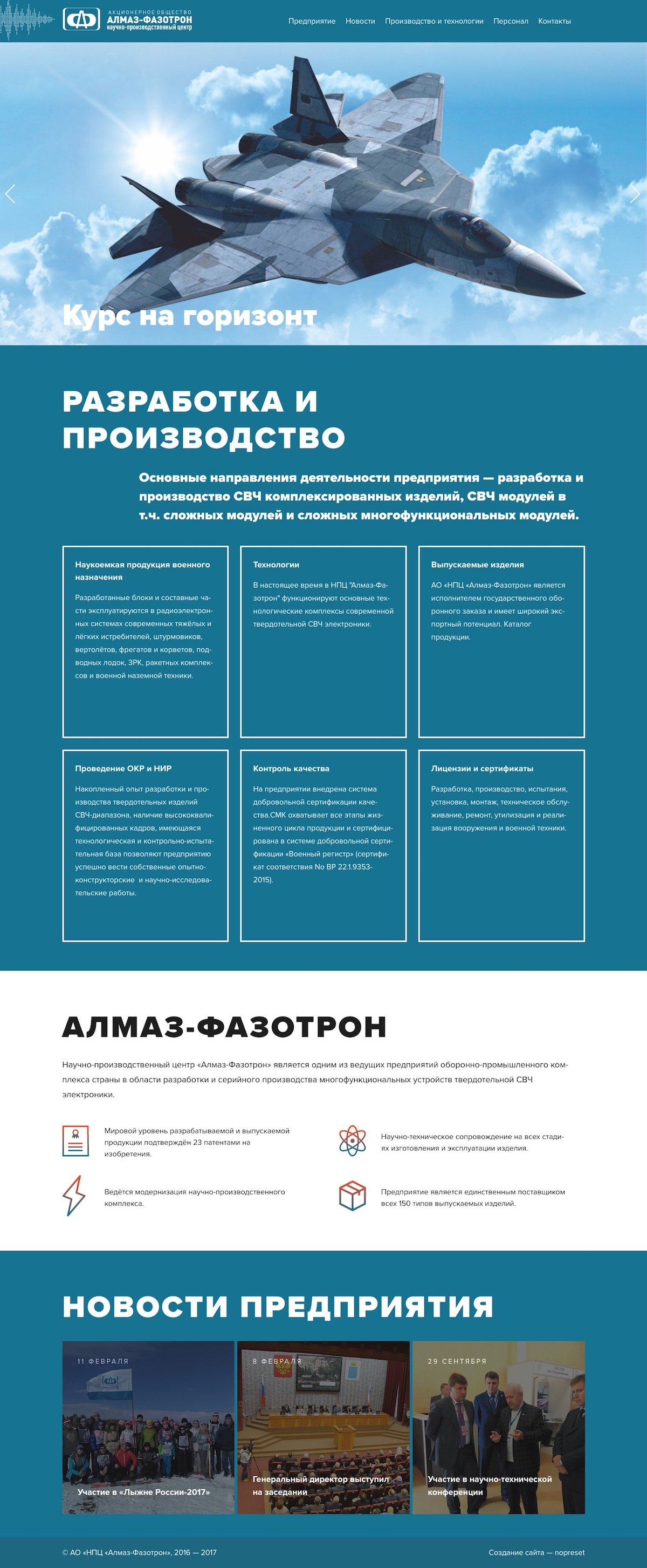 Алмаз-Фазотрон — оборонное предприятие. Обратились к нам за разработкой корпоративного сайта, который будет содержать в себе основную информацию о деятельности компании.