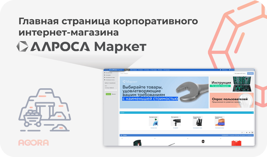 • Создание корпоративного интернет-магазина на платформе AGORA: АЛРОСА.МАРКЕТ — электронная торговая площадка для малоценных закупок, реализованная на базе платформы AGORA с адаптацией под нужды компании.