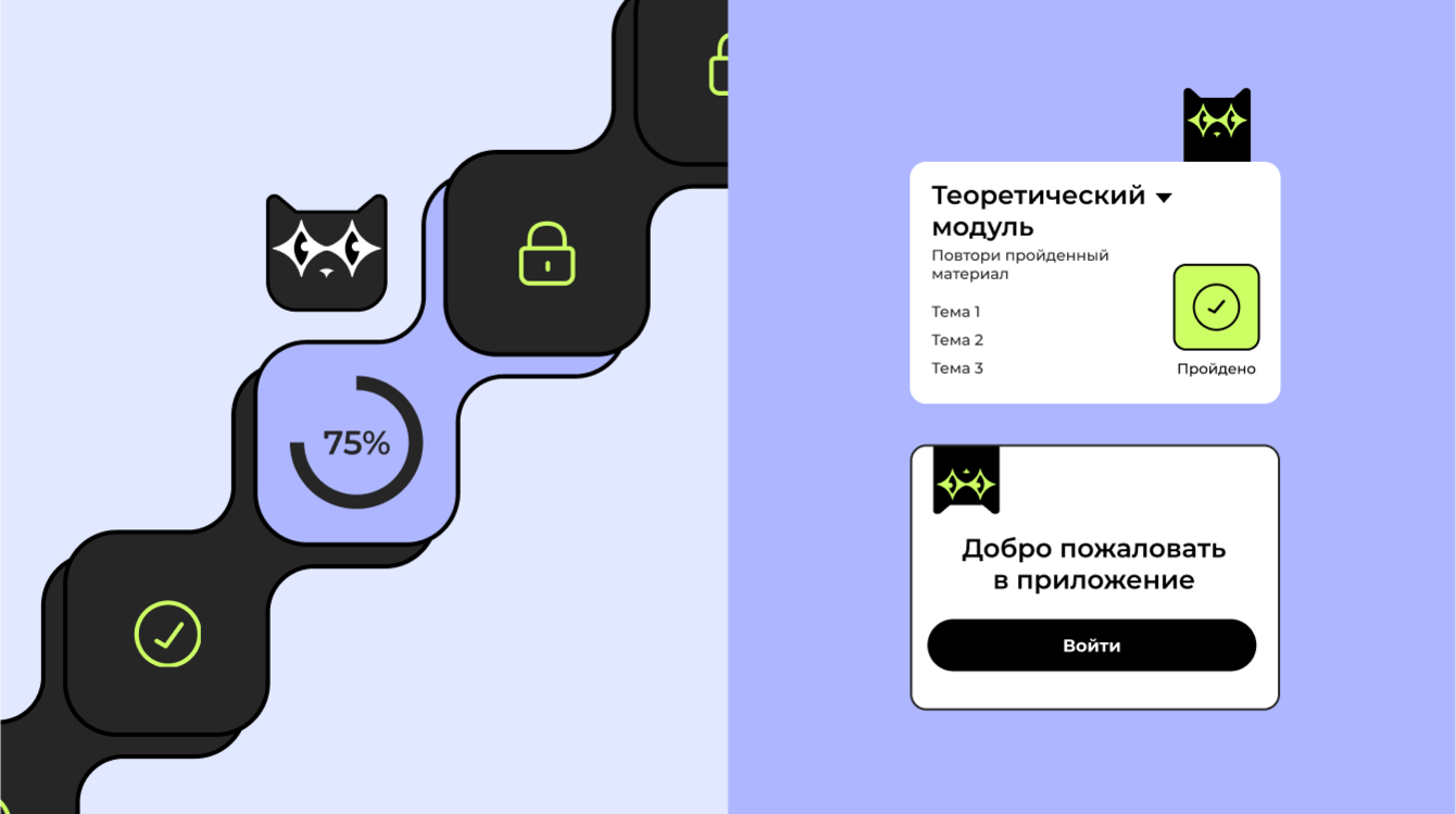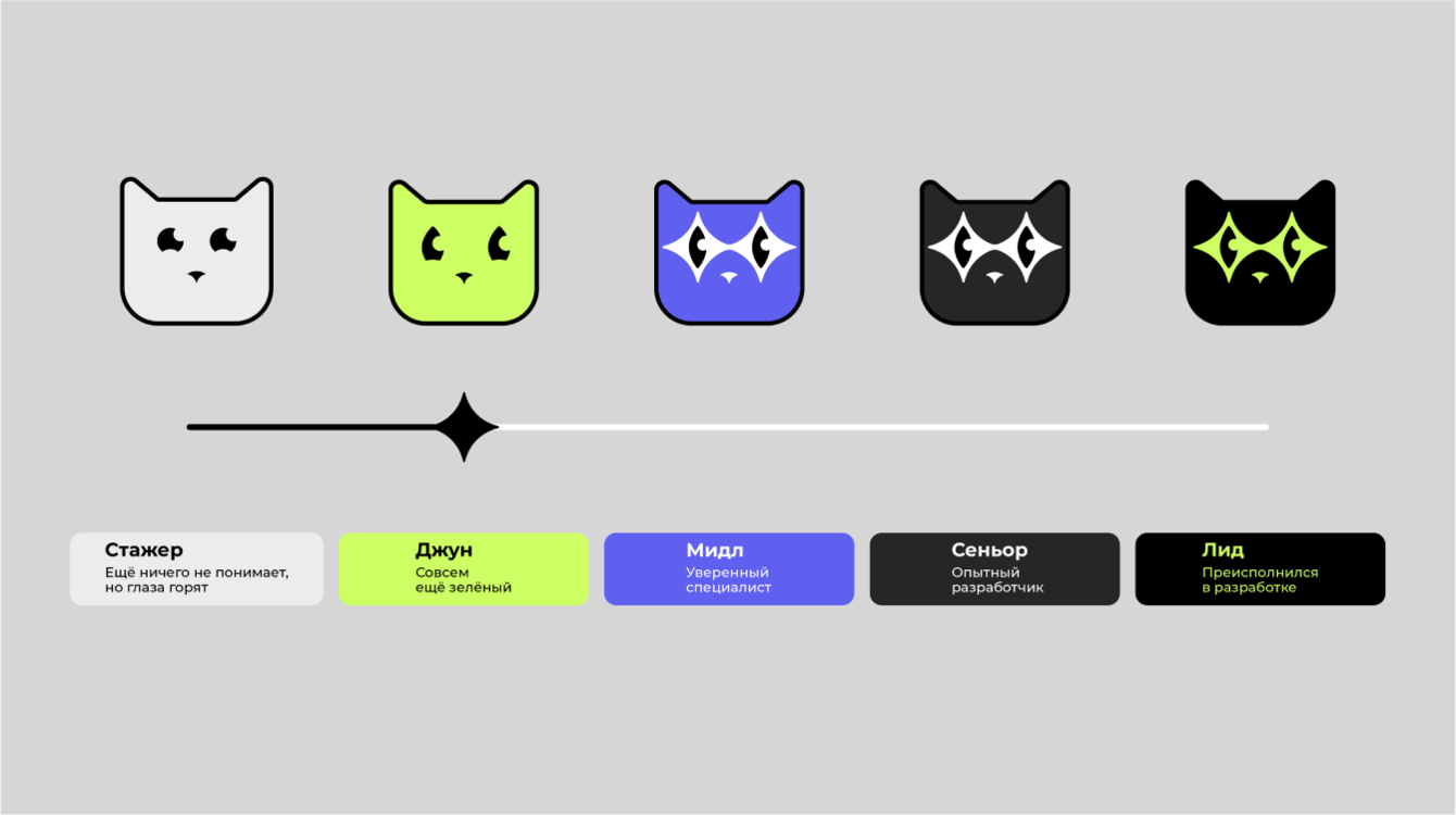 Мы передали метафору адаптивности через персонажа — гибкого кота, который стал символом профессионального роста. Ранее оценка компетенций IT-специалистов и составление сводных таблиц производилась в ручном режиме, приложение решает задачу автоматизации этого трудоёмкого процесса.