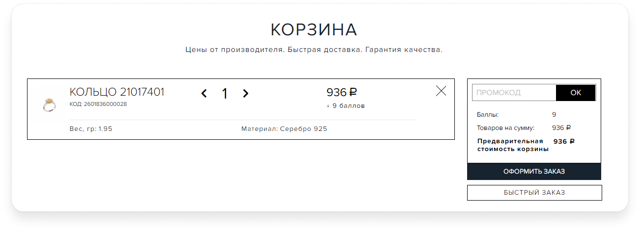 Кастомизировали корзину: отображается не только дефолтная информация, но и размер скидки в процентах и количество бонусных баллов. Это позволяет покупателю лучше ориентироваться в ценообразовании интернет-магазина.