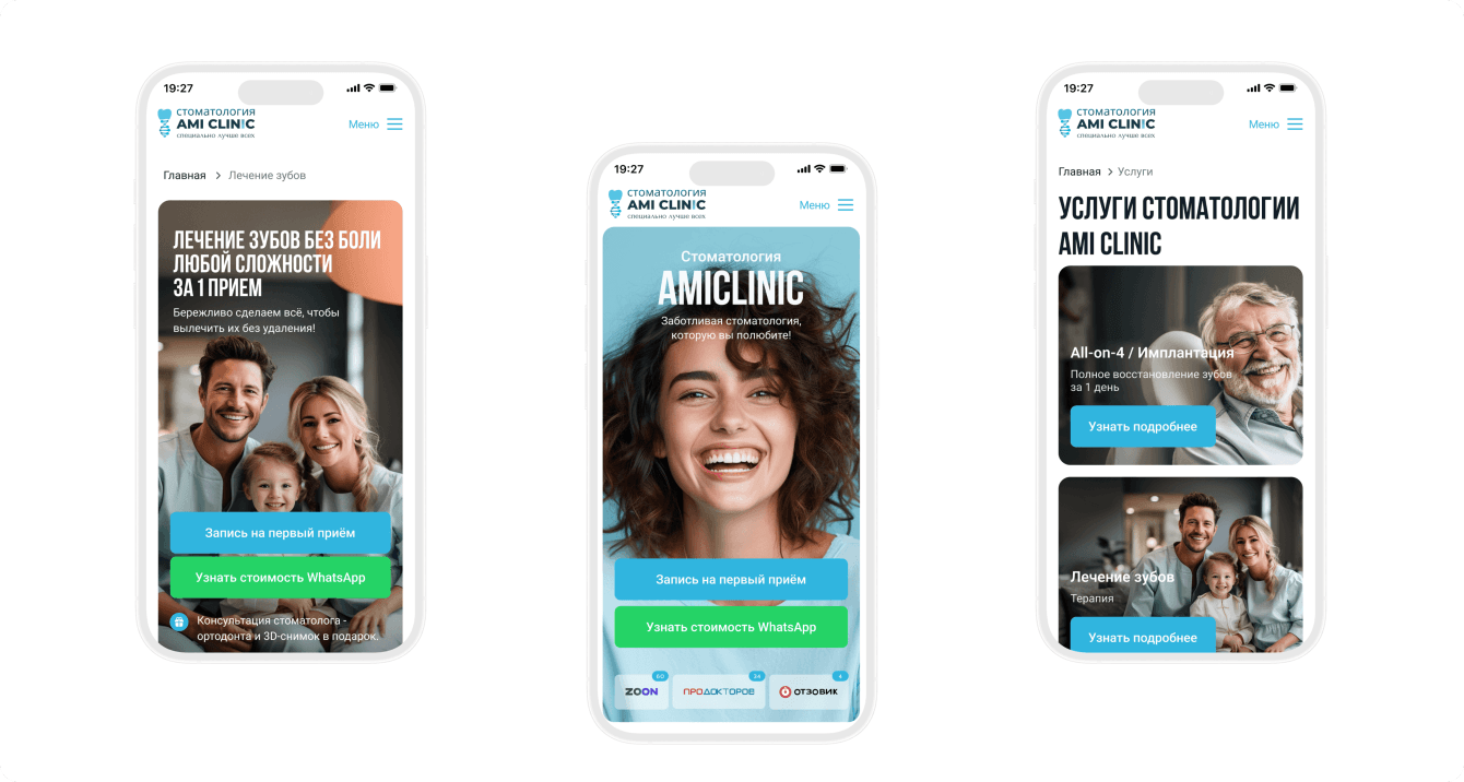 Каждая страница имеет возможность для пользователей оставить заявку на запись, а также рассчитать стоимость лечения с помощью специального квиза;