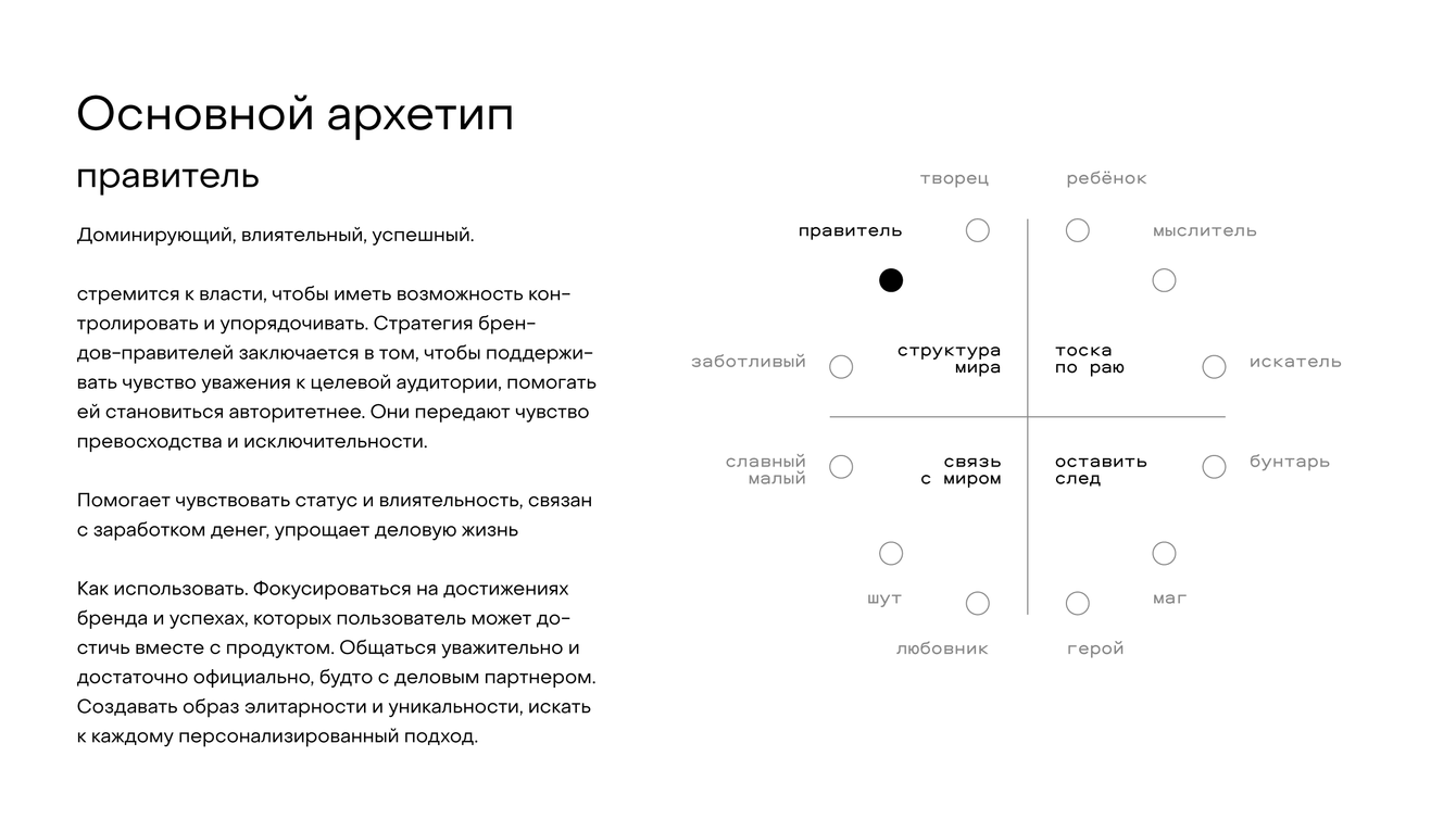 Мы провели с CEO брифинг, обозначили позиционирование, характер и ближайшие цели. После чего определили 2 архетипа: