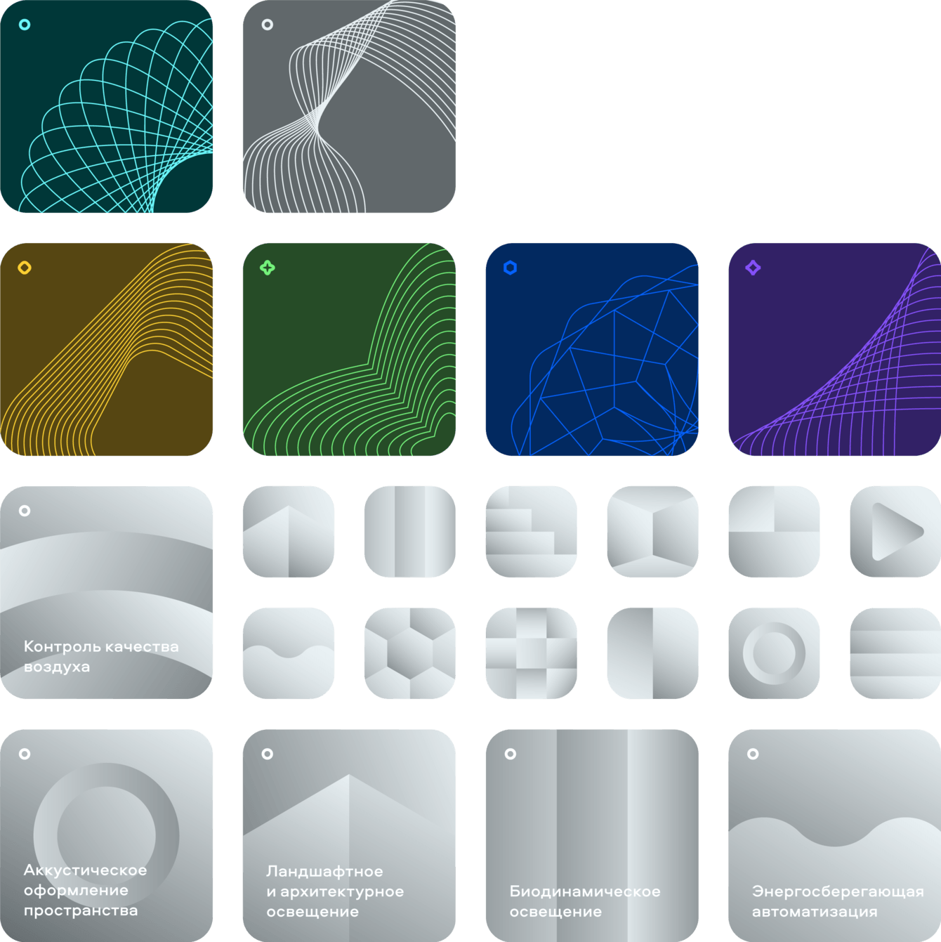 После, мы проработали палитру и создали набор фирменной иконографики для основных направлений и каждой услуги.