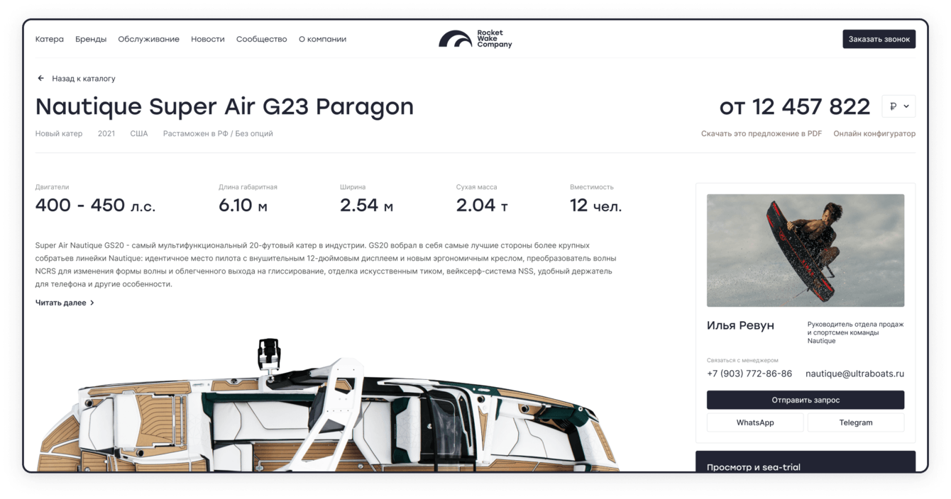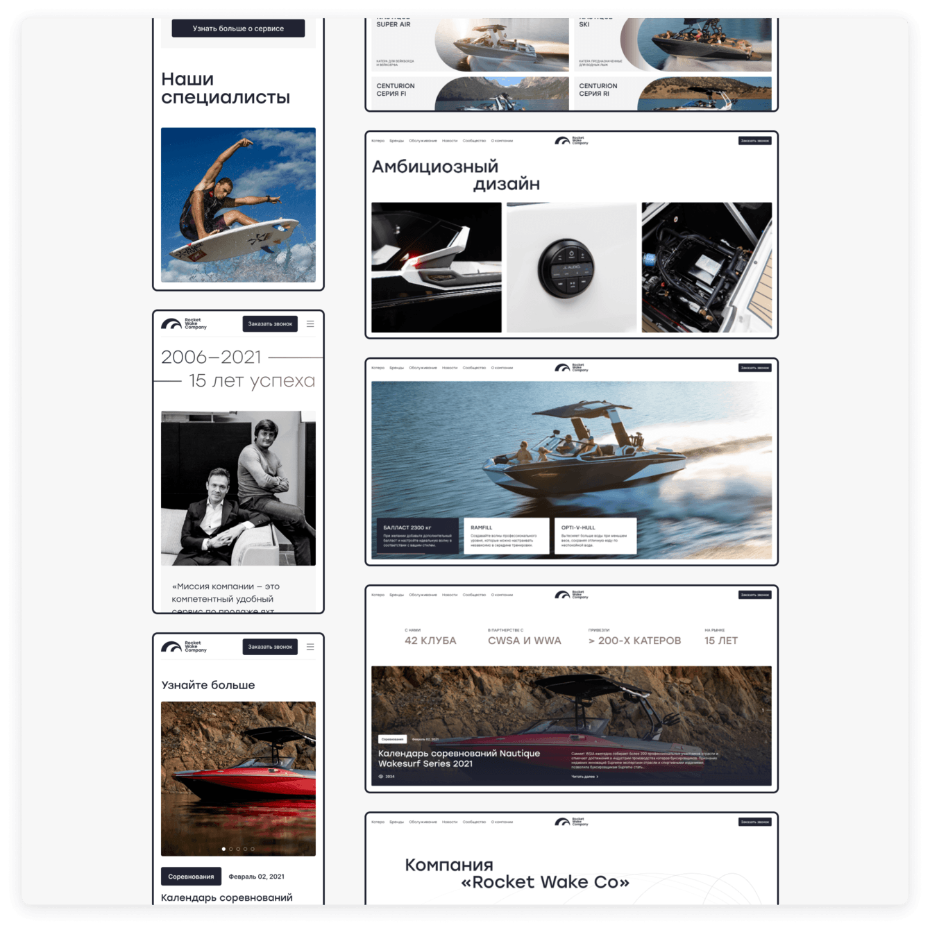 К горячему летнему сезону нужно было разработать и запустить сайт с проработанными UX и UI для компании Rocket Wake — дистрибьютора спортивных катеров-буксировщиков для вейксёрфинга. Приобрести катера могут как частные лица, так и компании, поэтому сайт должен быть понятен и привлекателен как для b2c, так и для b2b сегмента.