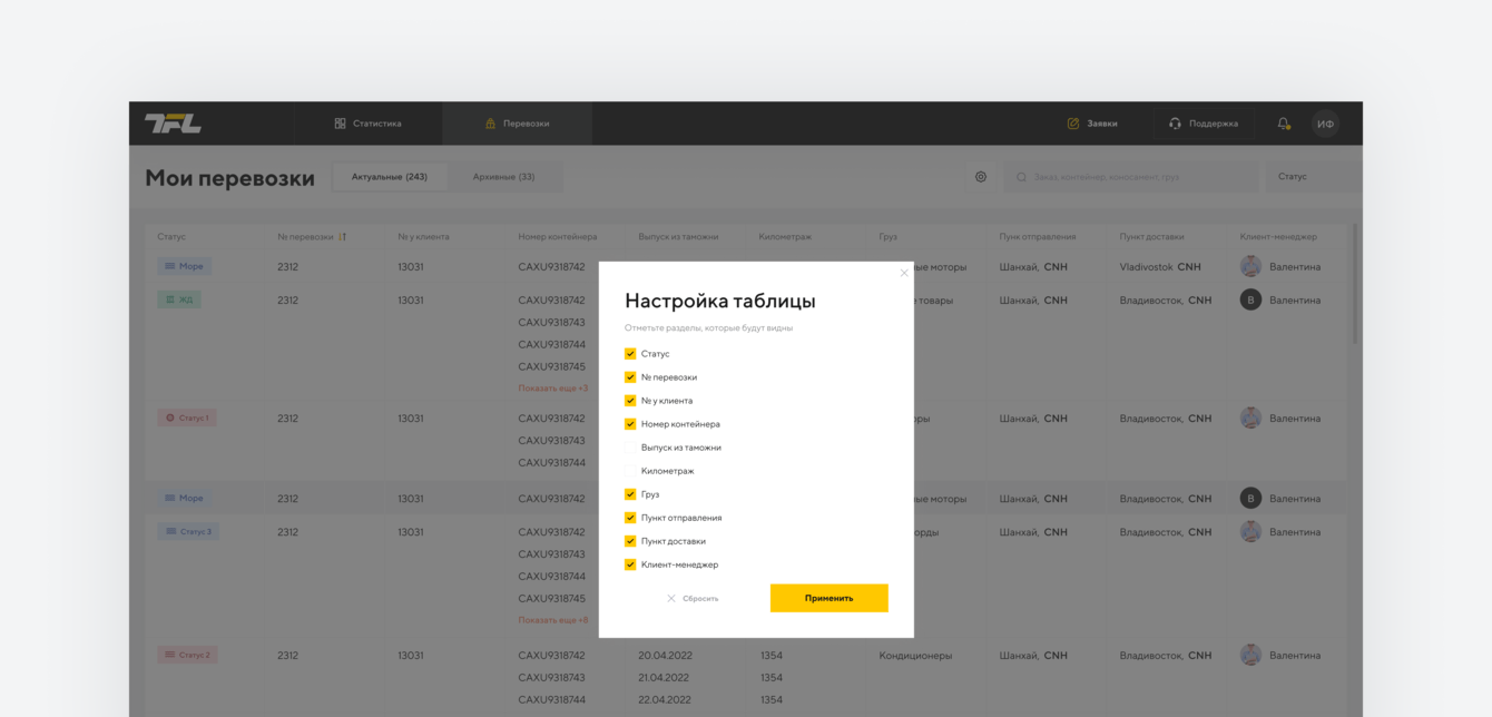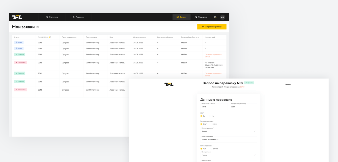 С помощью модуля “Заявки” клиенты теперь могут напрямую передавать данные о новых заказах на перевозку и отслеживать их состояние.