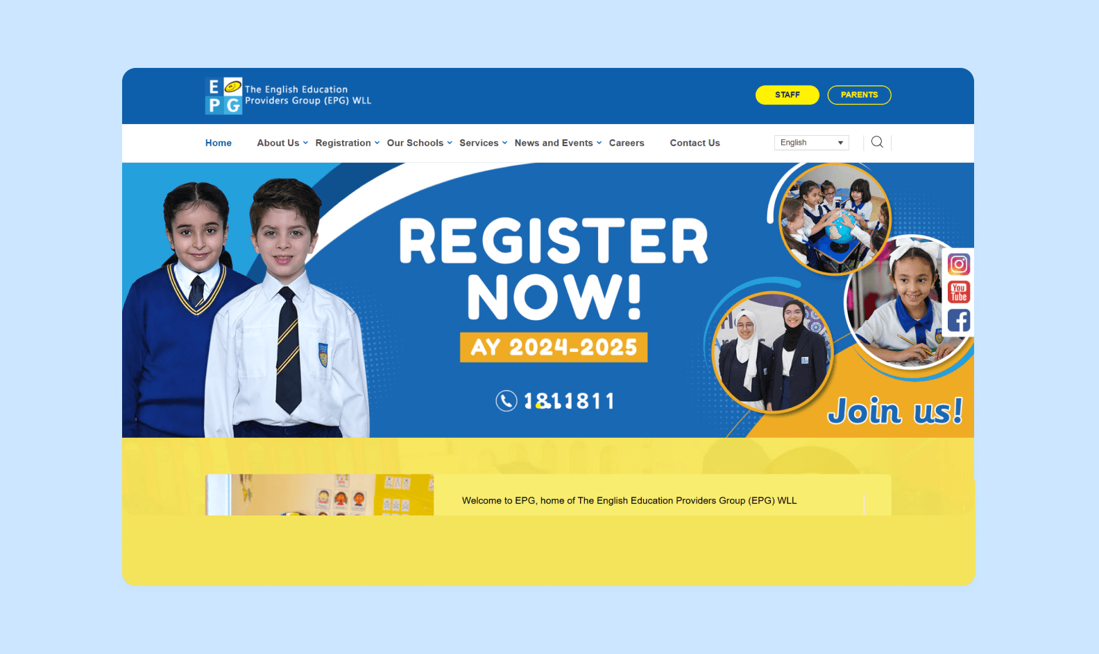 К нам обратилась сеть частных школ из Кувейта — The English Education Providers Group (EPG). Компания работает в сфере образования с 1975 года и в этом году празднует свое пятидесятилетие. Рекорд среди наших клиентов!