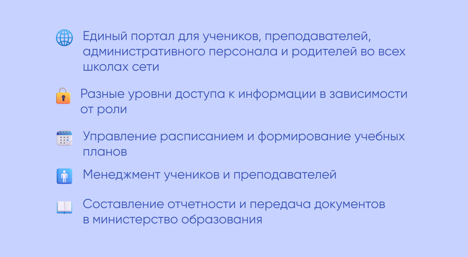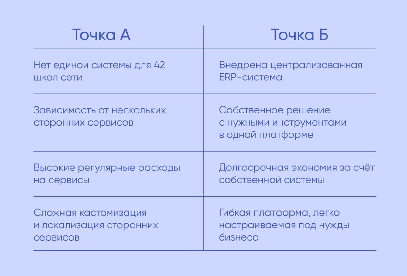 Раньше заказчики использовали несколько сторонних сервисов, и у школ сети не было единой системы. Со временем стало понятно, что это неудобно и дорого для бизнеса.