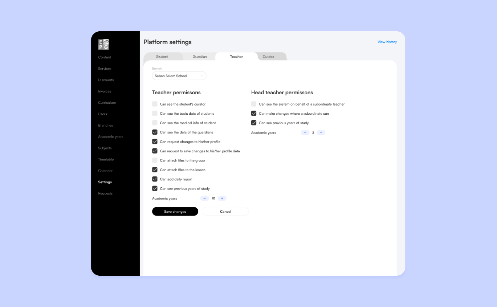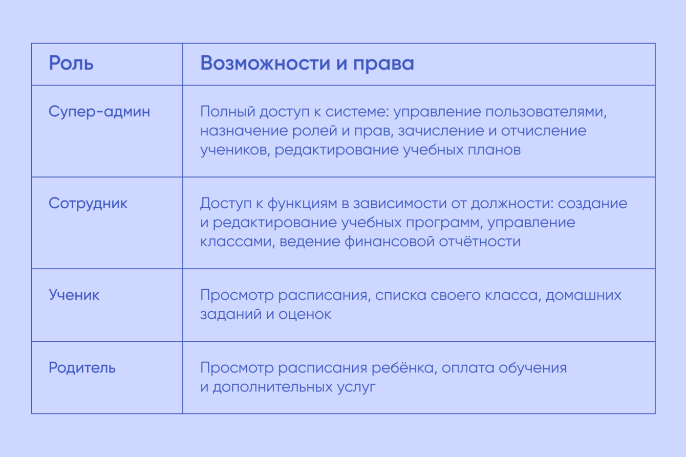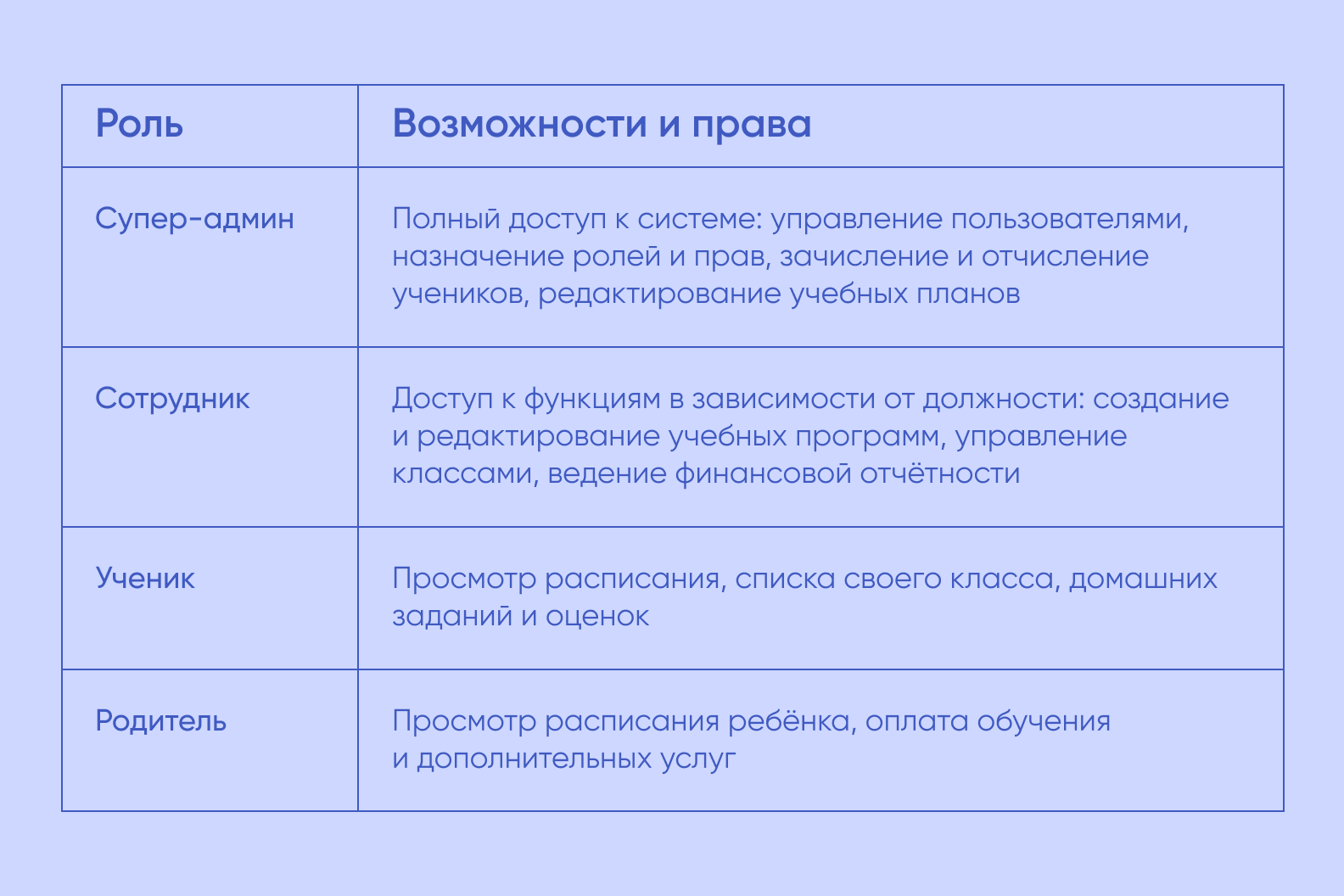 Например, админ может разрешить учителям просматривать определенную информацию про учеников: данные их родителей, медицинскую информацию и другое. Аналогичные настройки есть и для всех остальных ролей