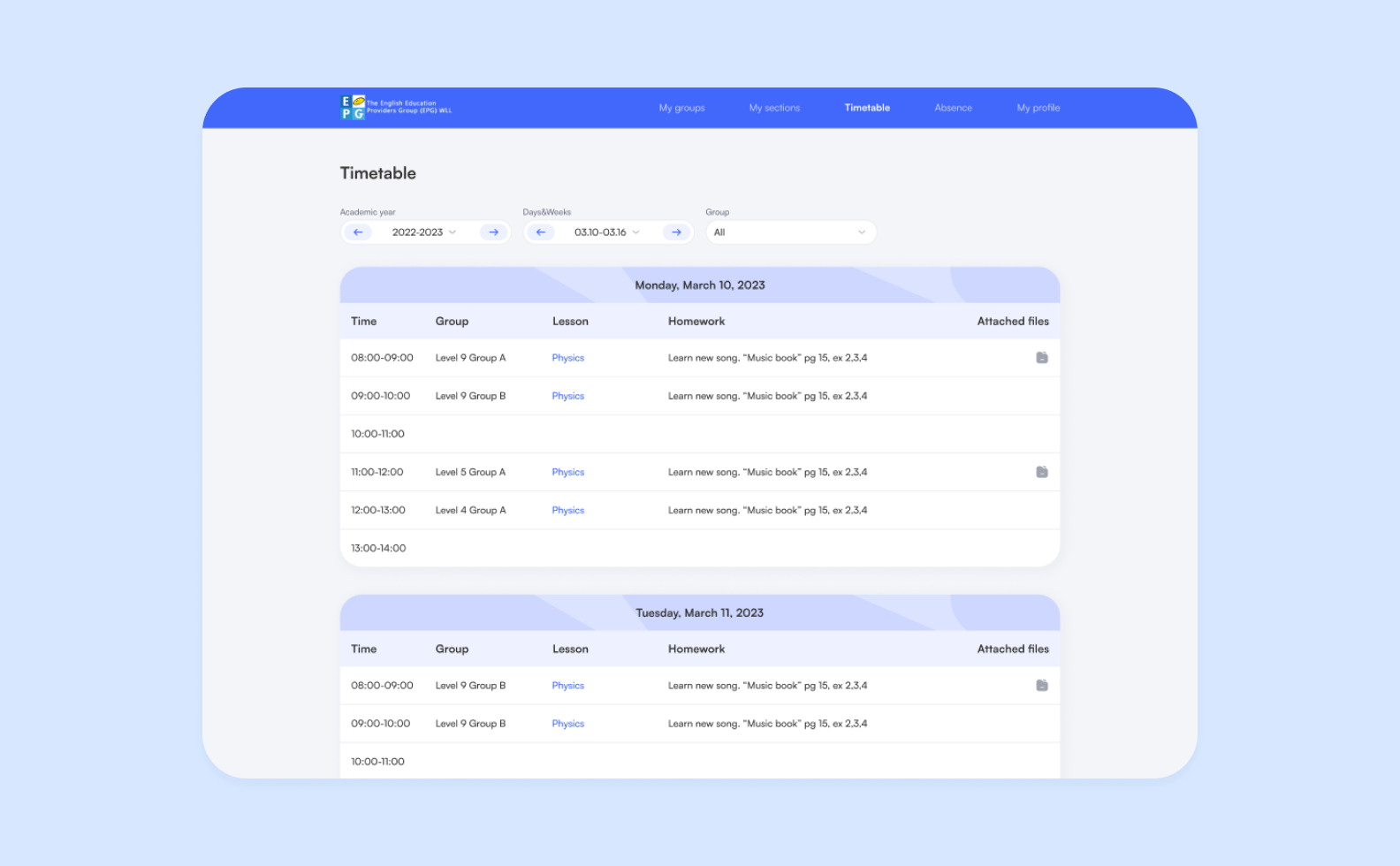 Дизайн и разработка заняли около 11 месяцев. Мы передали заказчику готовый к релизу проект вместе с полной документацией. В настоящее время команда EPG готовится к развертыванию новой платформы.