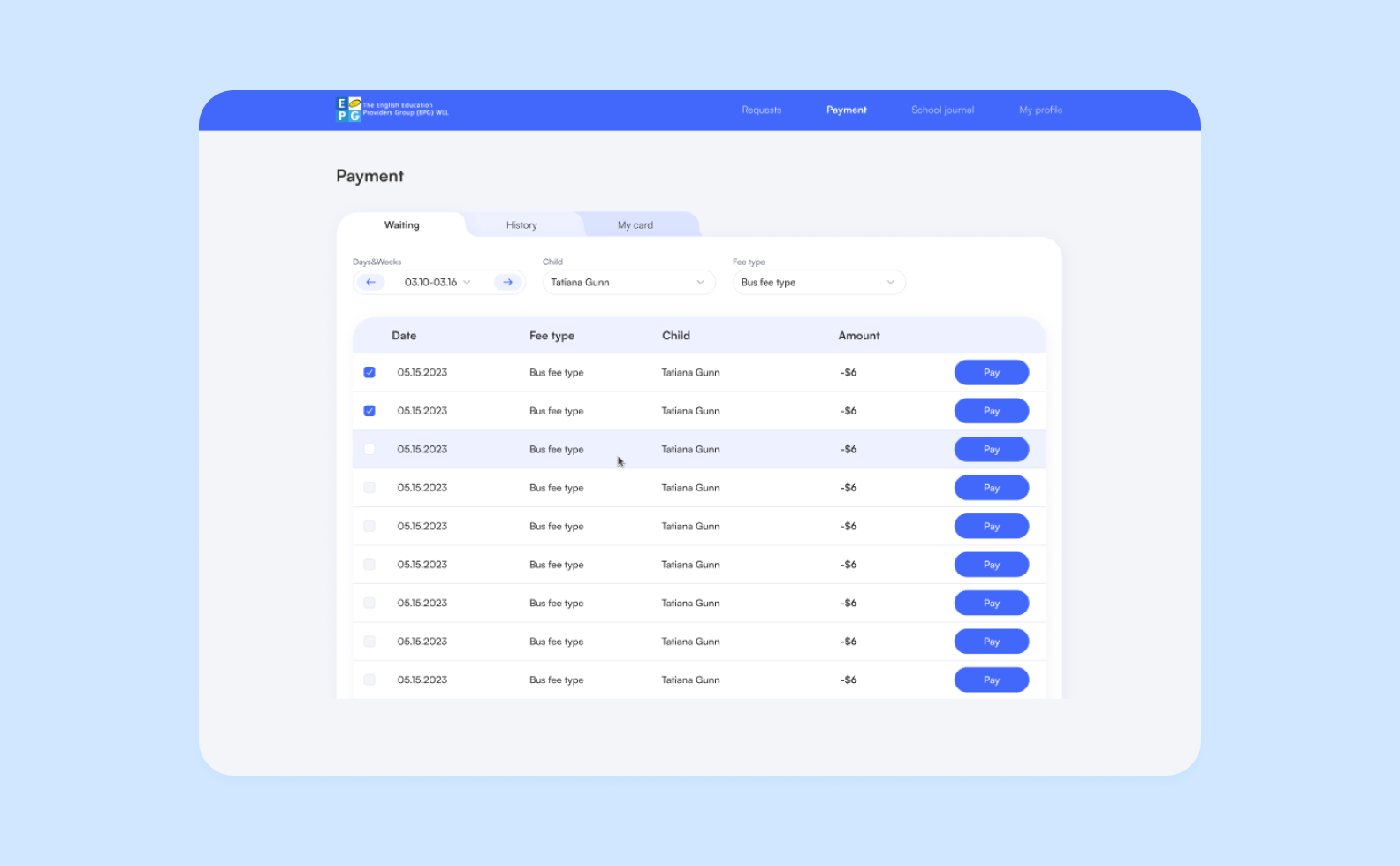Флоу оплаты для родителя. На платформе можно оплатить не только учебу, но и дополнительные услуги, например, школьный автобус