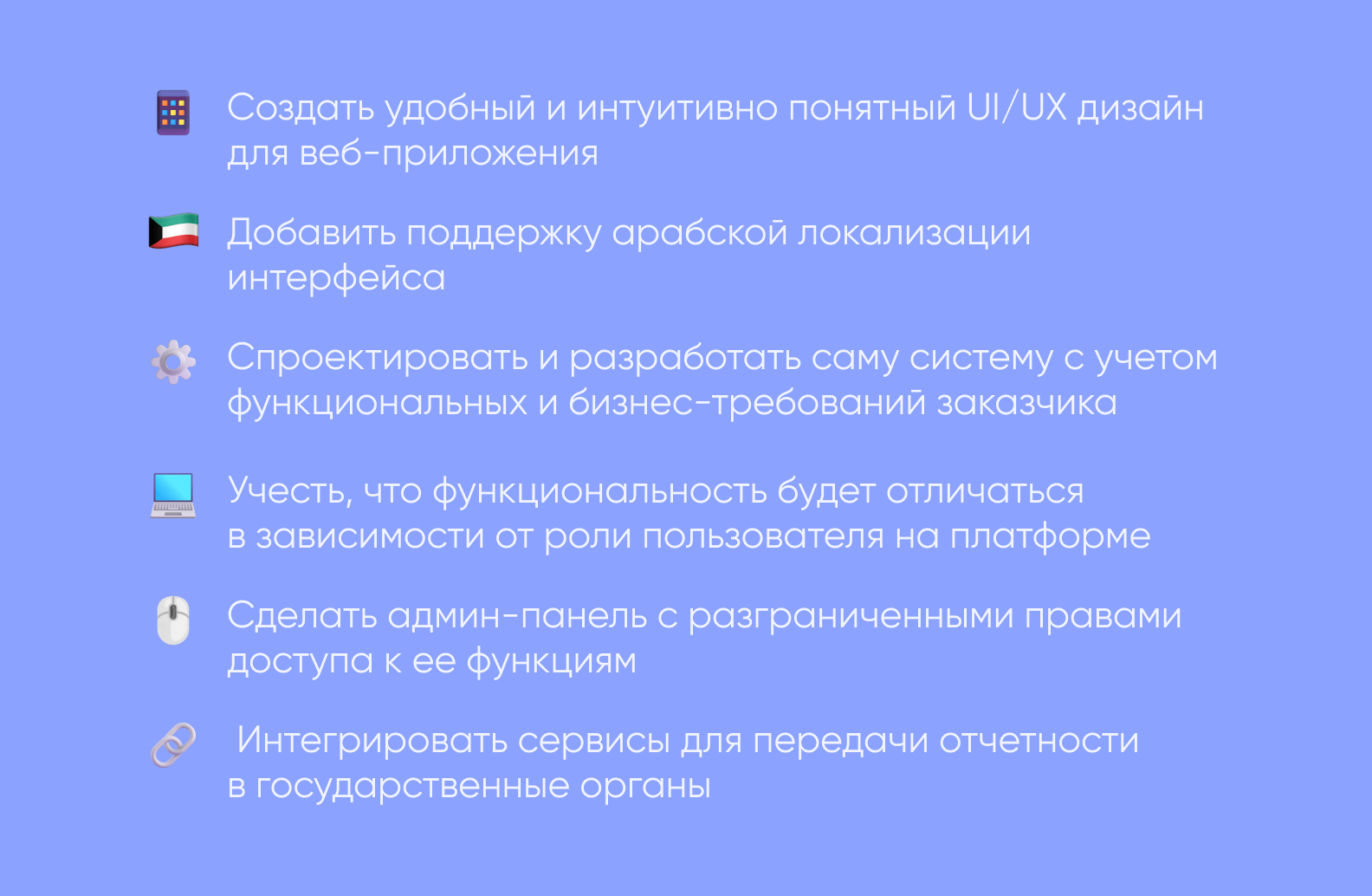 Искали подрядчика за пределами Кувейта, но с опытом работы в этом регионе. Другой важный критерий — подходящий технологический стек, чтобы в будущем не возникло проблем с поддержкой и масштабируемостью системы.