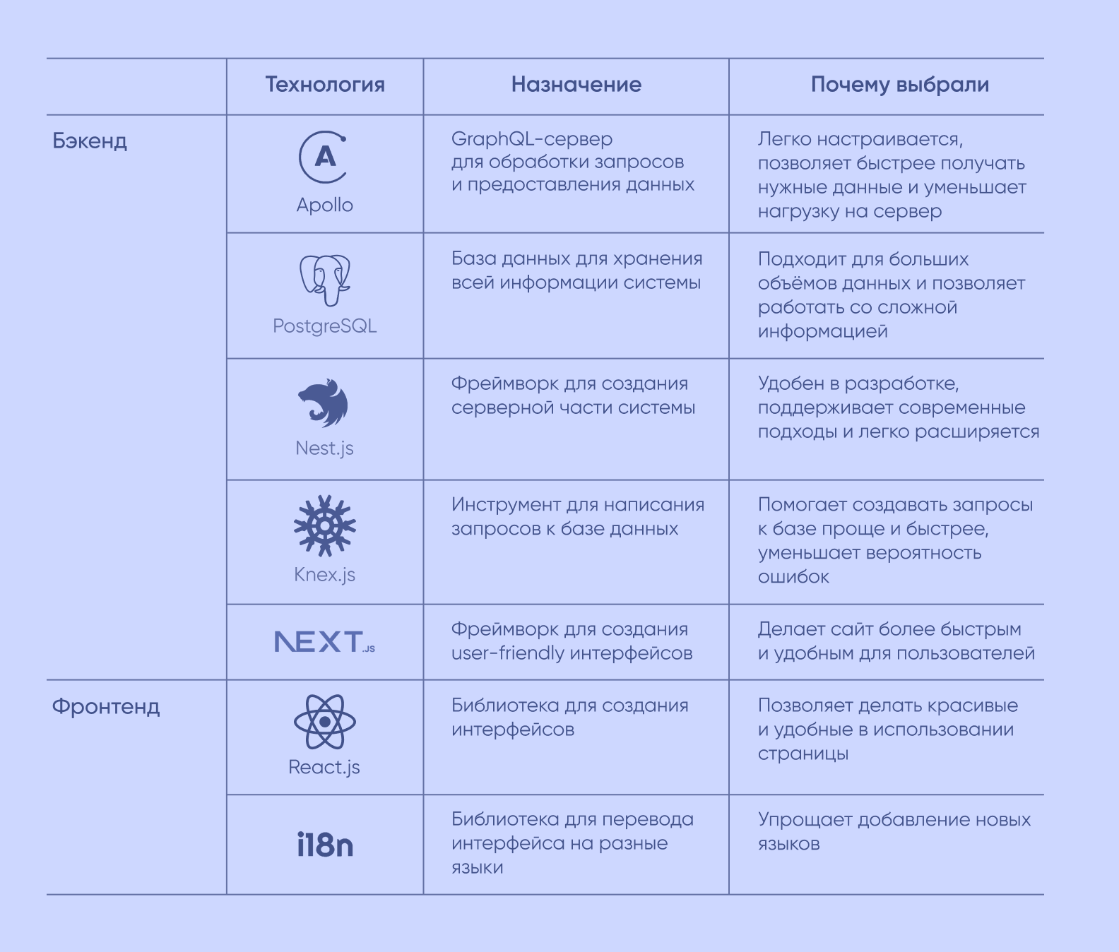 Для заказчика было принципиально важно, чтобы мы использовали технологии, которые позволяют легко масштабировать инфраструктуру, обеспечивают стабильность работы и выдерживают нагрузки. Вот какие технические решения мы выбрали.