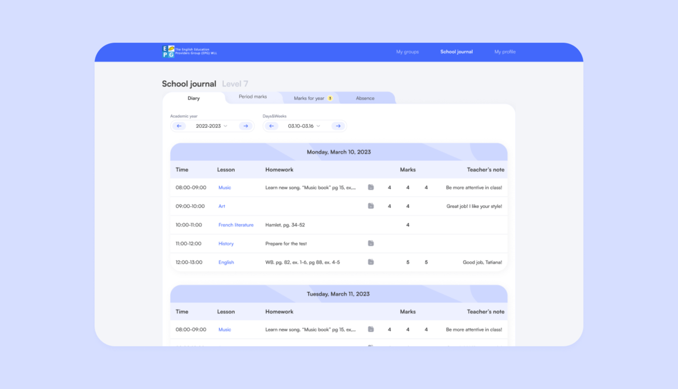◾️ Так выглядит дневник со стороны ученика. Для более удобной и быстрой навигации сделали вкладки, чтобы можно было переключаться между другими страницами дневника