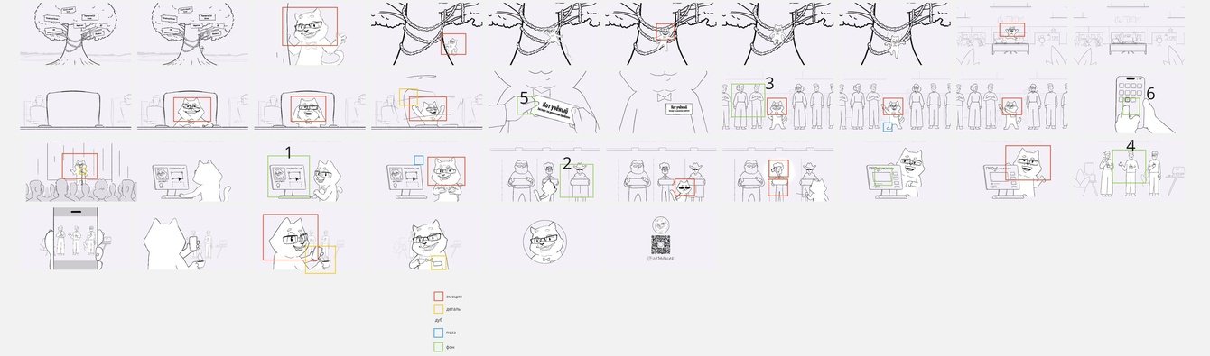 На следующем этапе мы разрабатывали иллюстрации и фоны для обоих роликов. Поскольку в продакшн части проекта мы задействовали более 10 человек, было важно сохранять единство стиля и композиции каждой сцены.