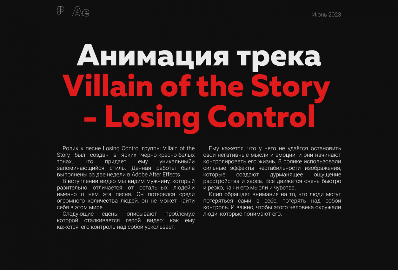 Ролик к песне Losing Control группы Villain of the Story был создан в ярких черно-красно-белых тонах, что придает ему уникальныйи запоминающийся стиль. Данная работы была выполнены за две недели в Adobe After Effects.