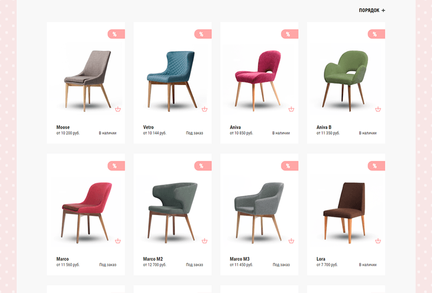 Дизайн сайта выдержан в строгом стиле, в теплых тонах с акцентом на фотографии. Для лучшей визуализации мебели используются ее изображения в интерьере. Качественный фото контент способствует повышению интереса пользователей и продаж в целом.