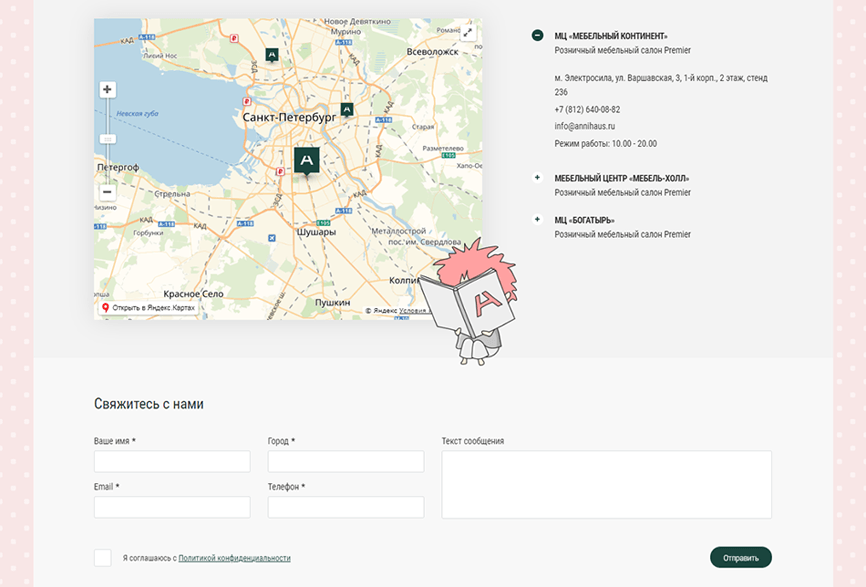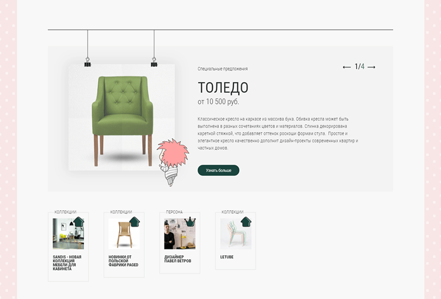 Добавили мультяшного персонажа девочки, который появляется на разных страницах сайта. Он был придуман и прорисован нашими дизайнерами. Милое изображение героя добавляет сайту индивидуальности, подчеркивает направление компании на семейную аудиторию.