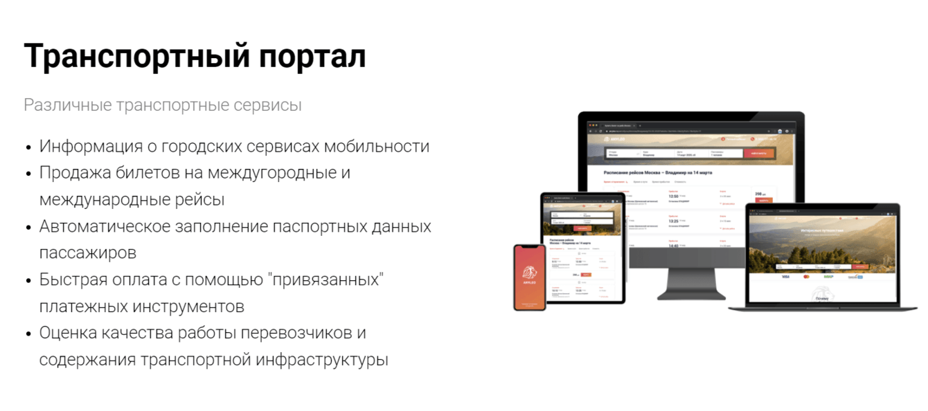 ● Онлайн покупка билетов на пригородном и междугороднем транспорте, в том числе и билетов с паспортными данными.