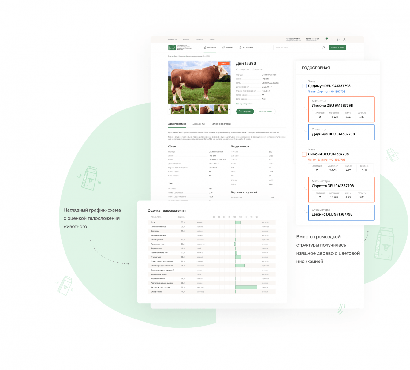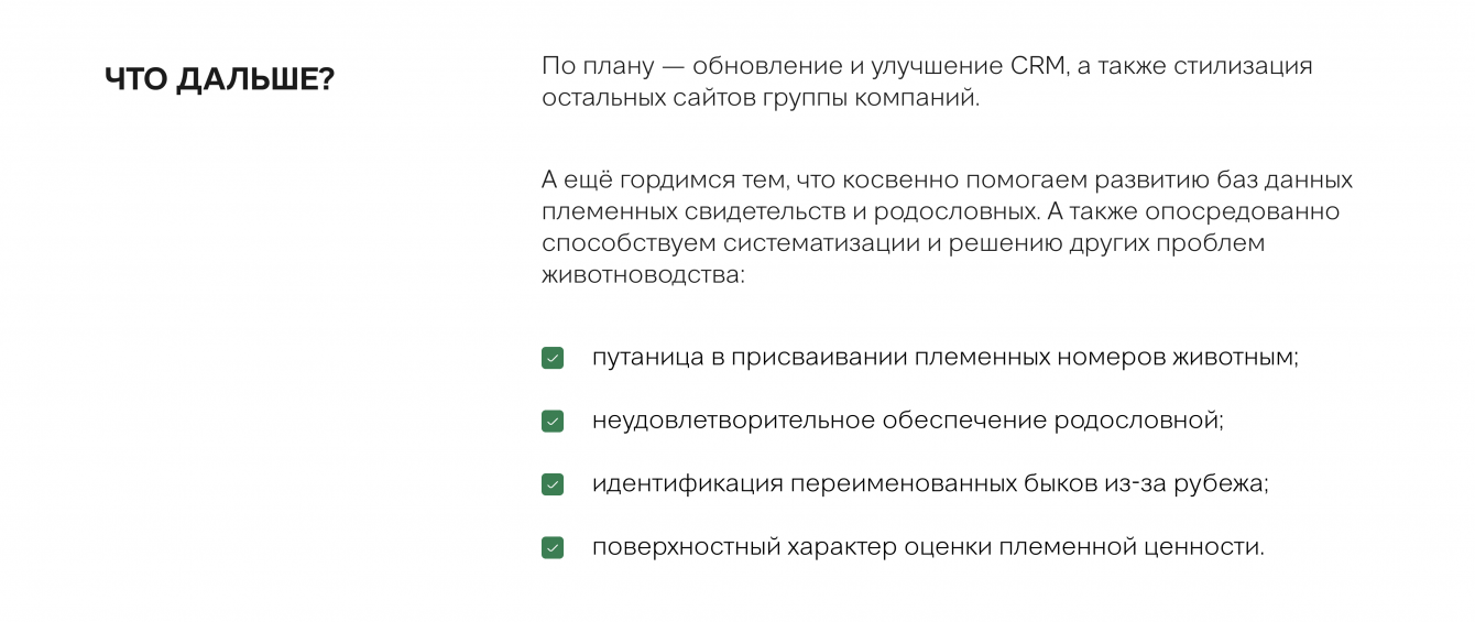 Глубоко погрузились в тематику, изучили терминологию, нашли конкурентов и проанализировали лучшие практики. Просмотрели множество иностранных сайтов и pdf-каталогов. Поняли механику и параметры, по которым отбирают животных для племенного животноводства.
