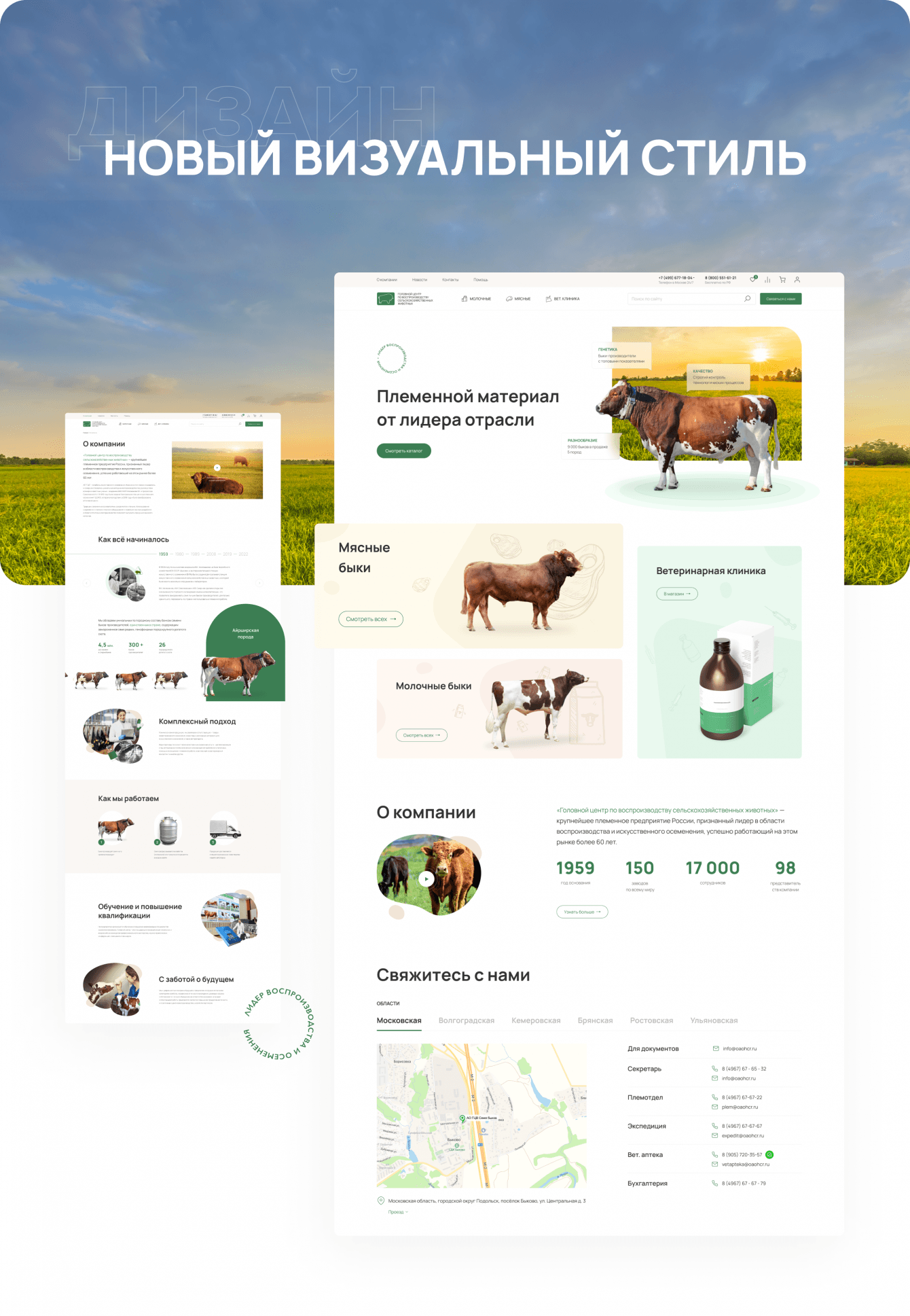 От предыдущего дизайна остался только фирменный цвет и логотип компании. Вместо формального сайта мы разработали дружелюбный и лёгкий сайт. Расширили палитру оттенков, добавили природные цвета, которые перекликаются с окрасом коров. В дизайне использовали приятные обтекаемые формы.