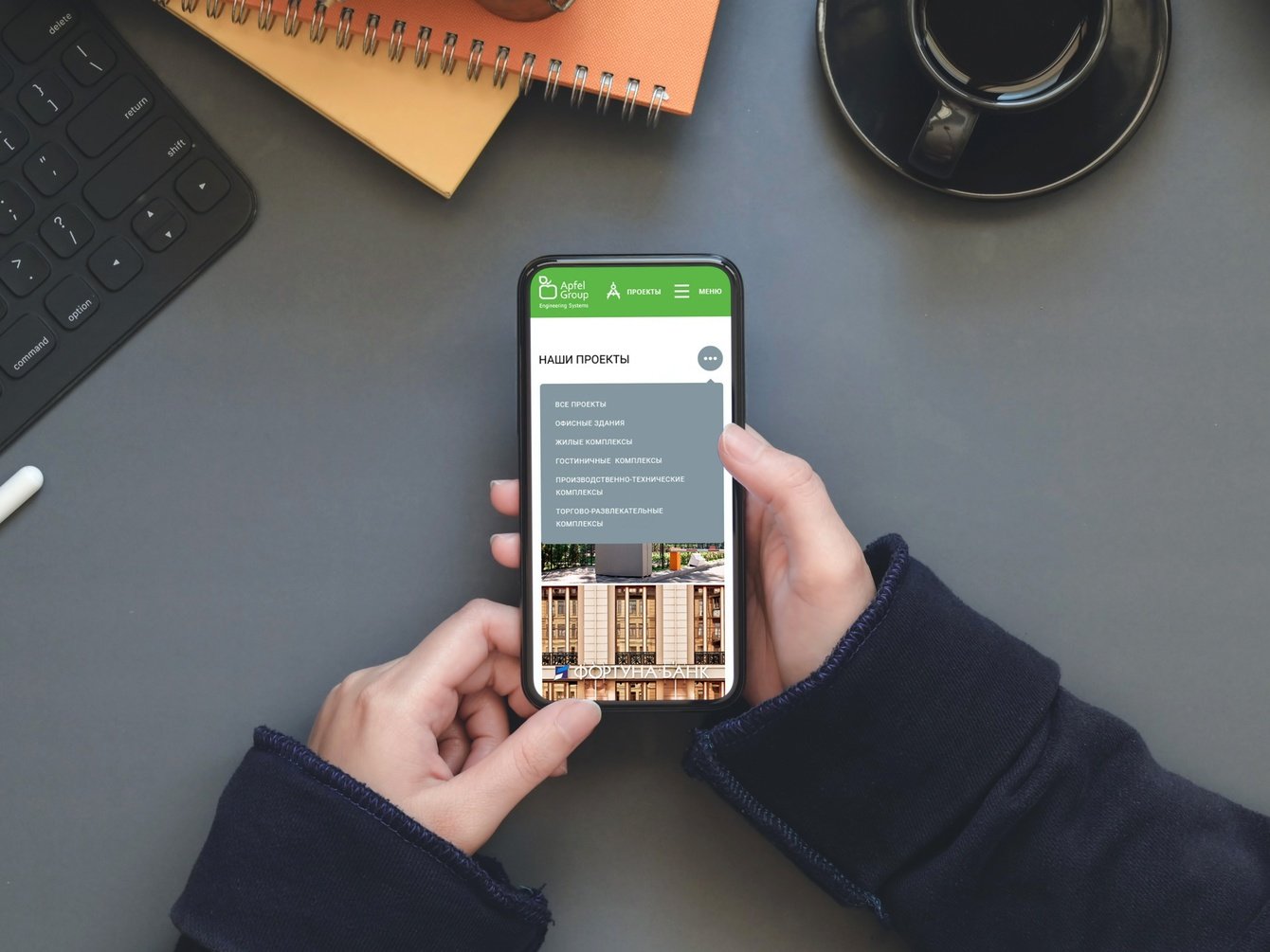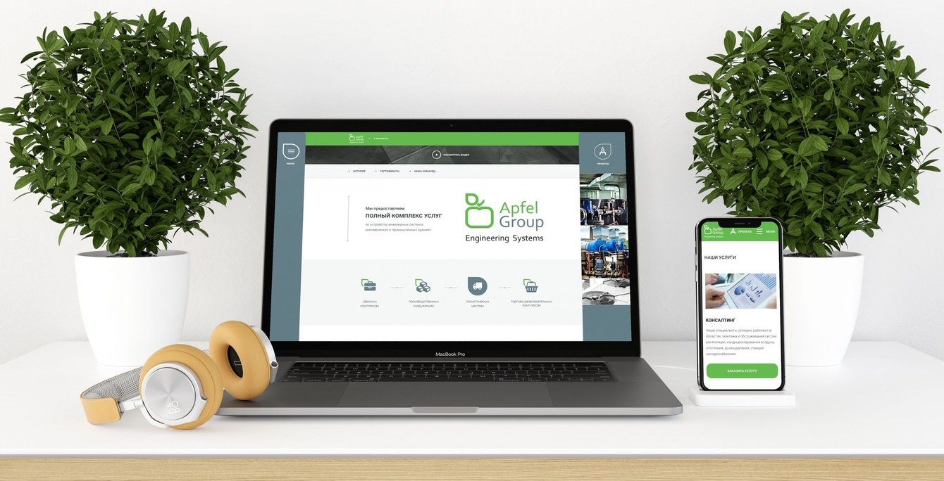 Необходимое условия современный сайтов. Адаптивная вёрстка сайта Апфель-групп отлично выглядит на всех современных устройствах и оптимально подстраивается под размер каждого из них.