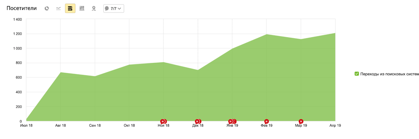 Крутая работа копирайтера со стороны Appbooster, крутая оптимизация от нас. График посещаемости стал неизменно расти. К апрелю 2019 года мы достигли показателя в 1200 посетителей:
