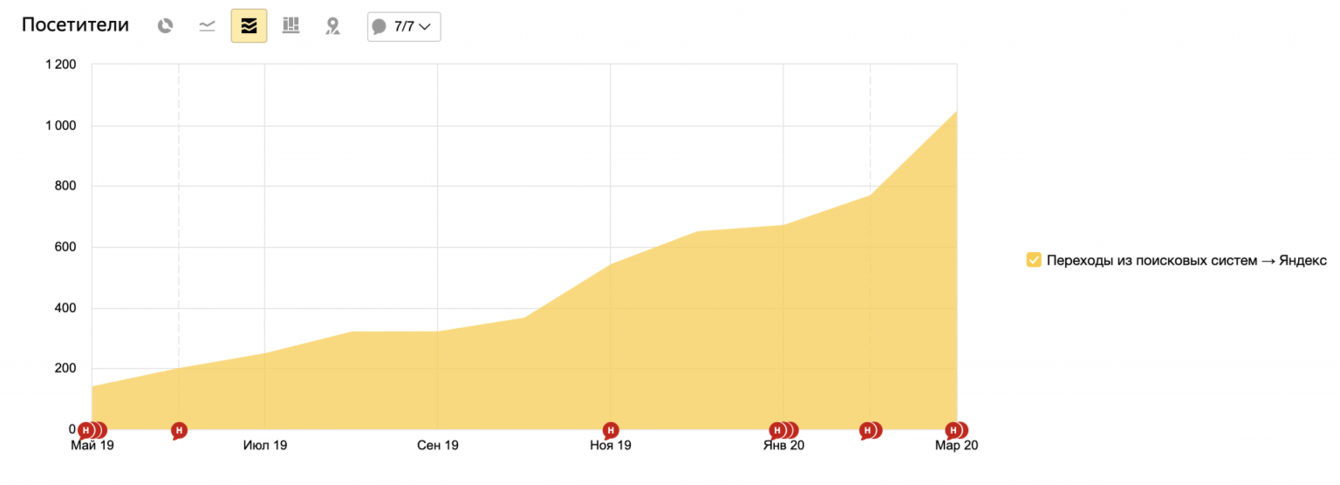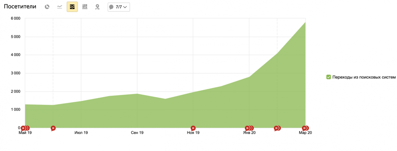 Такой бурный рост позиций должен был спровоцировать рост трафика. Так и вышло. На фоне 2020-го года все наши прошлые результаты кажутся смешными. Но именно работа в 2018-м и 2019-м заложила фундамент этого успеха.