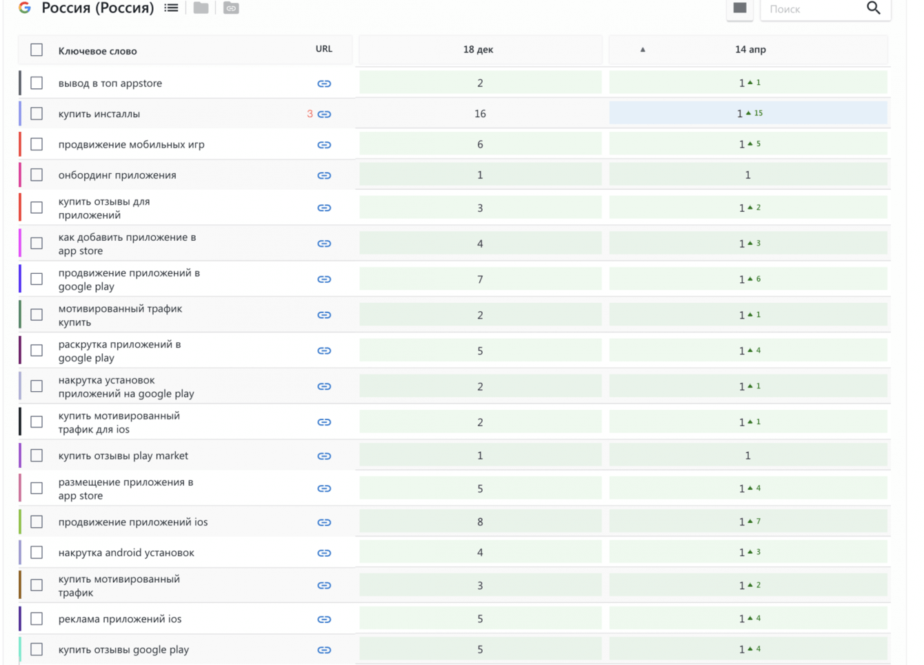 Результаты превзошли наши ожидания. К апрелю мы добились того, что средняя позиция запросов в Google равна десяти. Из 243 отслеживаемых запросов, 173 находится в топ-5! Ну и добавим сюда тот факт, что выдача в тематике Appbooster геонезависимая, так что результаты действительны во всех регионах.