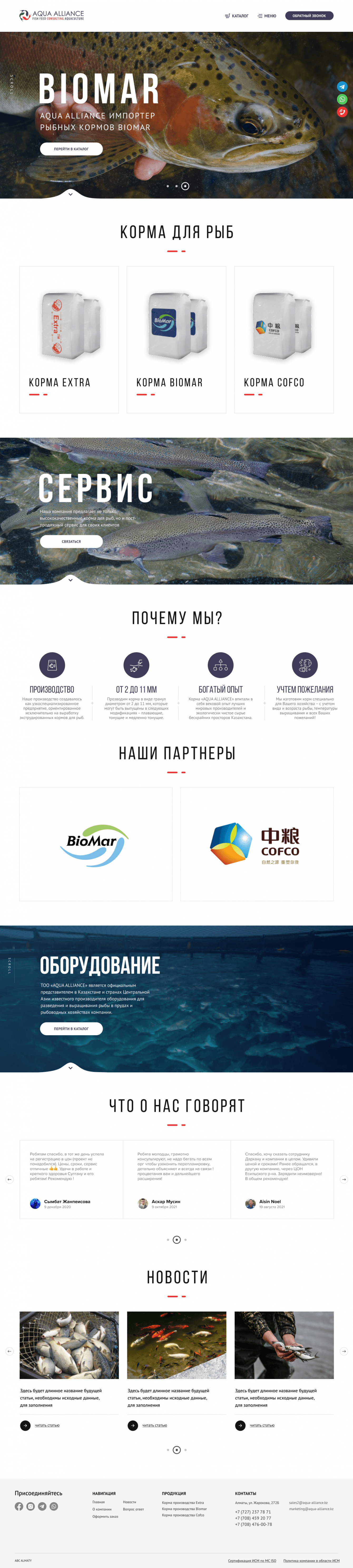 Задача: Нам требуется создать веб-сайт, который отражал бы нашу экспертизу в области аквакультуры, наличие передовых технологий и партнерские отношения с мировыми лидерами в этой сфере. Желательно, чтобы сайт был информативным, привлекательным и демонстрировал нашу профессиональную компетенцию, привлекая новых клиентов и деловых партнеров.