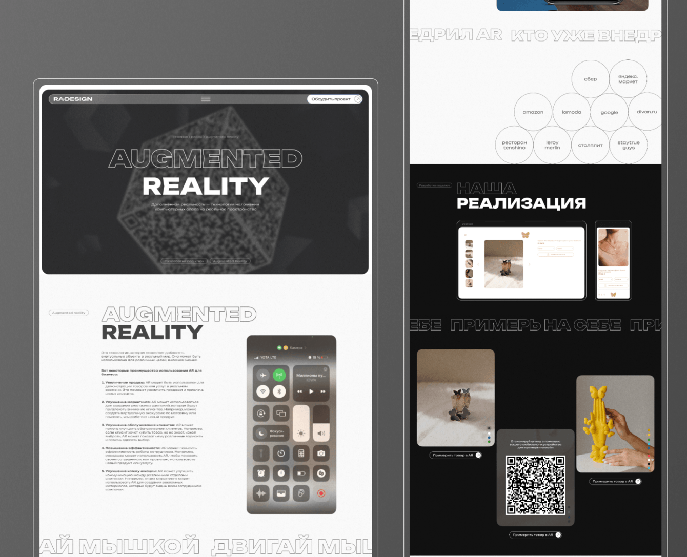 Так как не все наши клиенты знают о данной технологии, была поставлена задача разработать landing page с полным описанием дополненной реальности (AR), как она работает и чем может помочь бизнесу. Основной акцент должен быть сделан на самом механизме, чтобы в итоге у пользователя было полное представление о работе AR.
