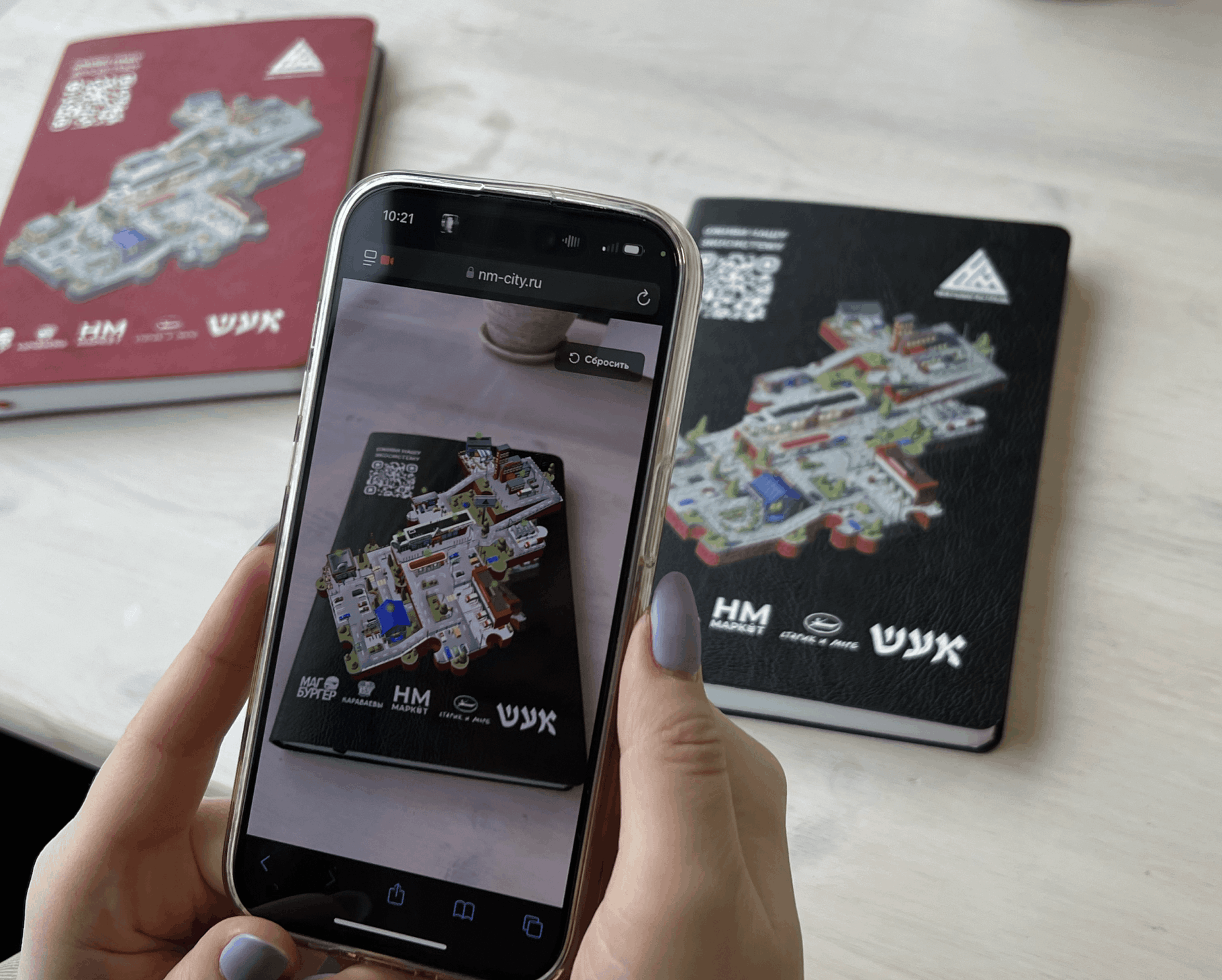 Вместо статичной полиграфии собрали интерактивный 3D-город-пазл. Пользователь наводит камеру на QR — в телефоне открывается webAR-сцена с улицами, зданиями и «жителями»: сотрудники занимаются зарядкой в парке, дети играют, собаки бегают по аллеям, по дорогам идут автомобили и фуры. Атмосфера бренда считывается моментально — за цифрами бизнеса появляется «живой» контекст.