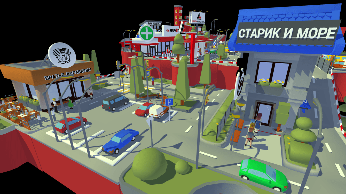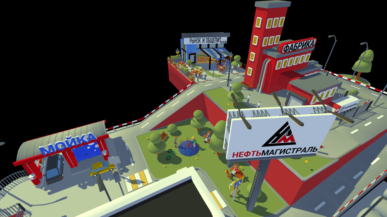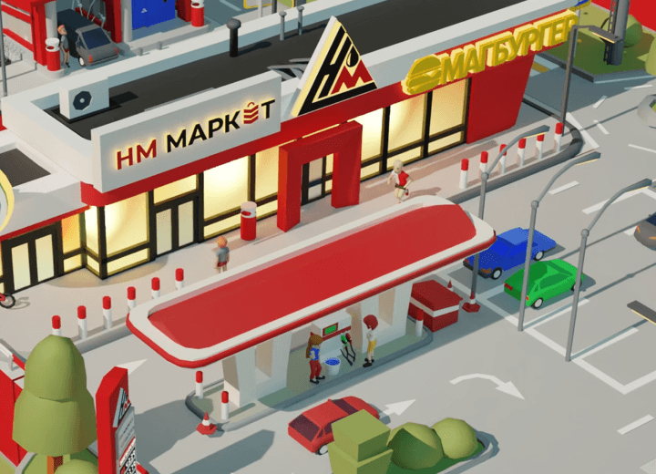 Чтобы сцена была не только зрелищной, но и «игралась», заложили простые механики: доставить продукты из распределительного центра в сеть общепита, вызвать курьера из ресторана, заправить или помыть автомобиль. Клик — действие — короткая анимация, и так по кругу; цикл работает как мягкая геймификация и удерживает внимание.