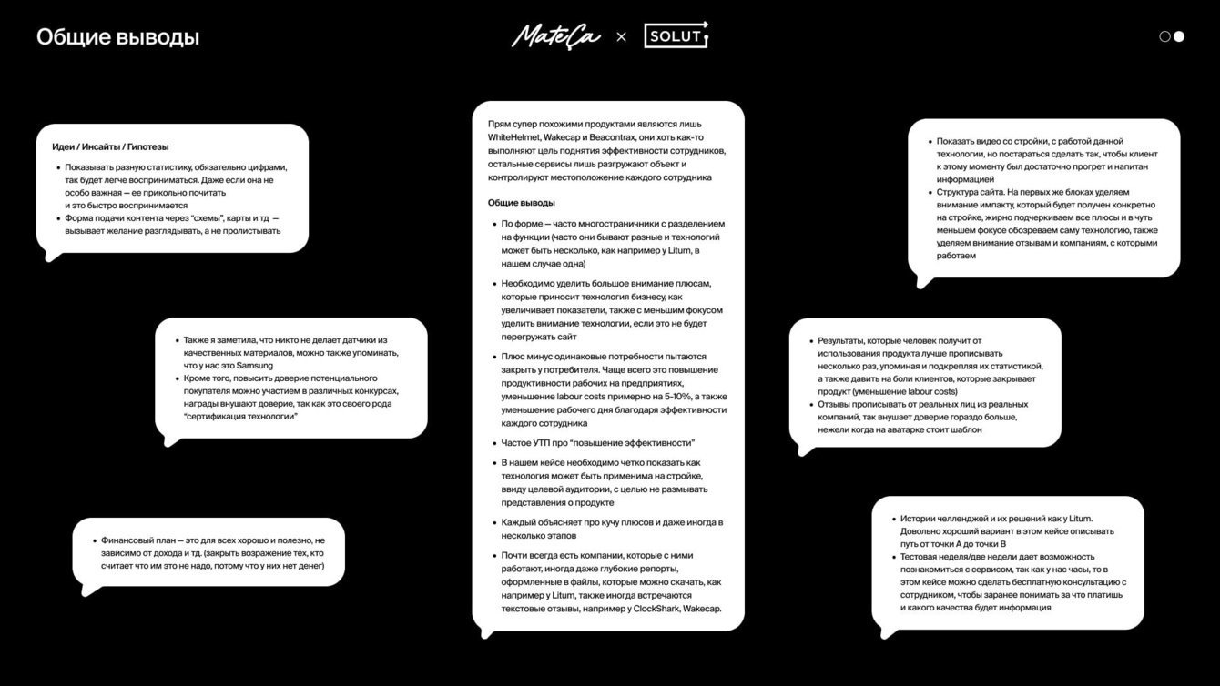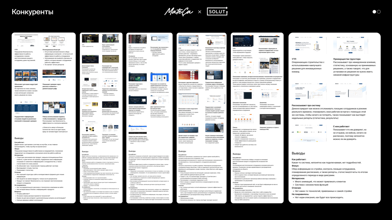 Так, главным выводом стал тезис, что у Solut действительно уникальный продукт. Мы нашли всего трех конкурентов, которые хоть как-то помогают повысить эффективность сотрудников, остальные — только разгружают объект и показывают, кто из сотрудников, где находится.