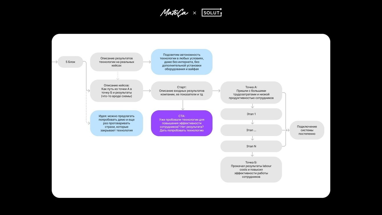 Следующий этап — проработка логики. Мы собрали все сценарии поведения пользователя, которые нужны на странице, и уложили их в блок-схему. Она показывает, какие блоки будут на странице, как между ними организована навигация и перемещение пользователя. В каком месте будет СТА, в каком — информация о технологии, а где — кейсы и графики.